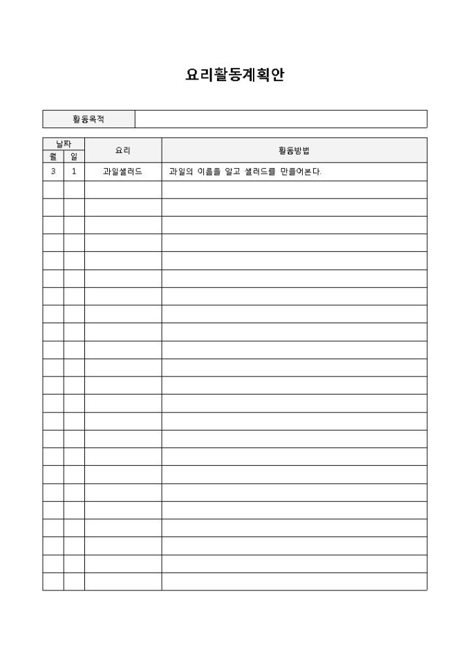 요리활동계획안(어린이집)입니다. 활동목적, 날짜, 요리, 활동방법 등의 항목으로 구성되어 있습니다. 어린이집에서 요리 활동을 할 경우 사용 할 수 있는 계획안 양식입니다.
