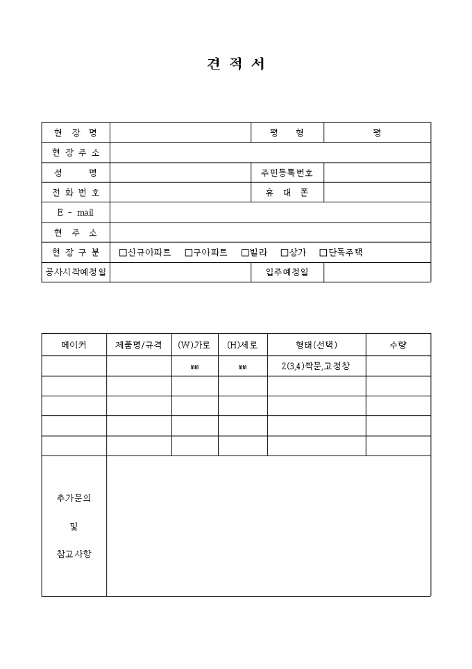9,000원/월샷시 설치 현장설명과 설치할 샷시의 메이커,제품명,크기등을 기록하는 견적서입니다.