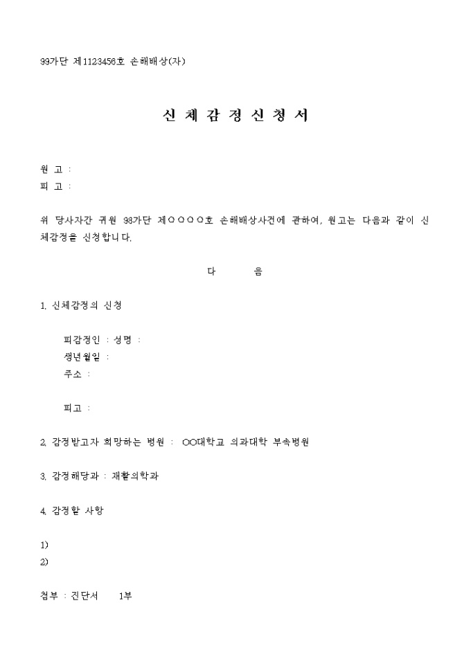 신체감정 신청서 양식입니다. 위 당사자간 귀원 98가단 제○○○○호 손해배상사건에 관하여, 원고는 다음과 같이 신체감정을 신청합니다. ...