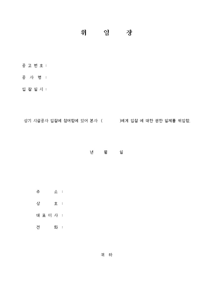 9,000원/월입찰에 관한 권한 일체를 위임한다는 내용입니다. 공고번호, 공사명, 입찰일시 등을 기재합니다.