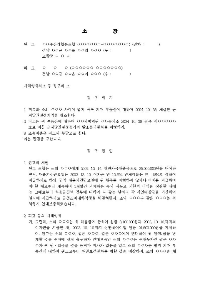 9,000원/월사해행위취소등청구 소장(근저당권말소)입니다.