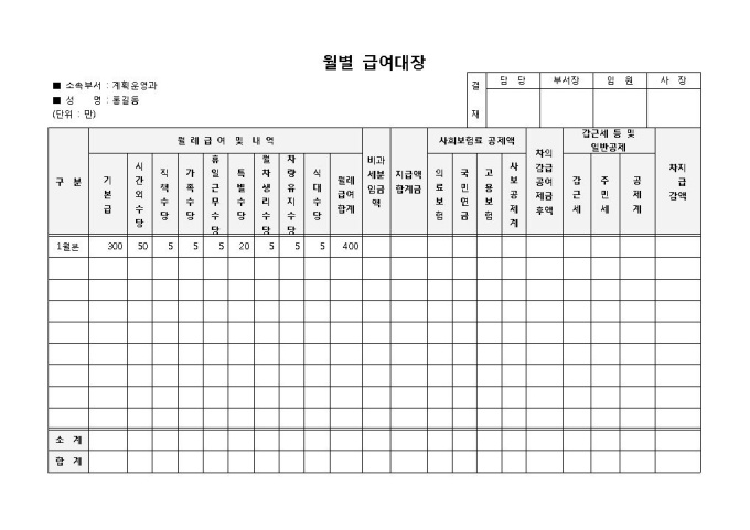 9,000원/월월별로 월례 급여의 내역, 사회보험료 공제액 등의 항목을 고려하여 급여의 기록 및 관리 시 사용되는 월별 급여대장 양식입니다. 소속부서, 성명, 단위, 구분, 급여액, 공제액, 합계 등의 항목으로 구성되어 있습니다.