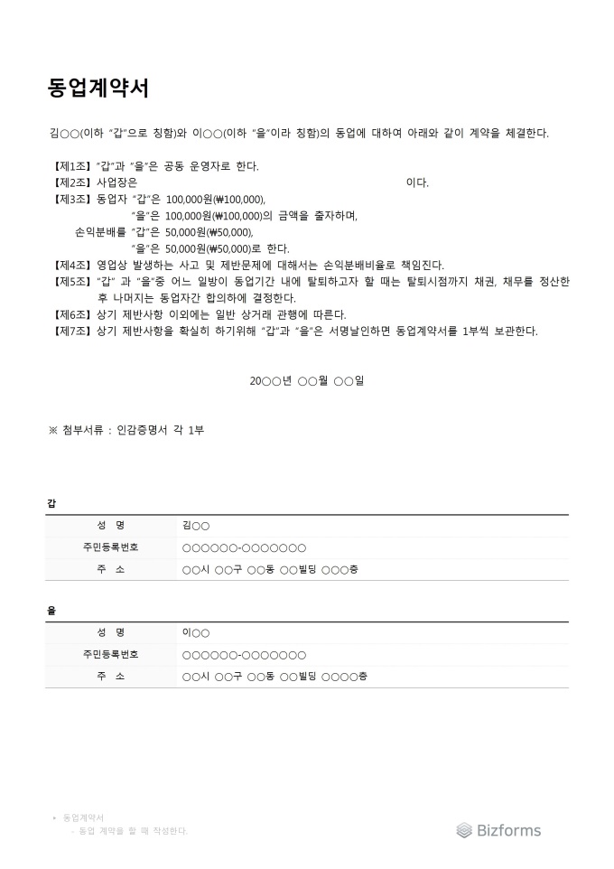 9,000원/월동업계약을 체결하기 위해 필요한 동업계약서 예시 양식입니다. 여러 조항과 체결자들간의 확인란 등의 항목으로 구성되어 있습니다.