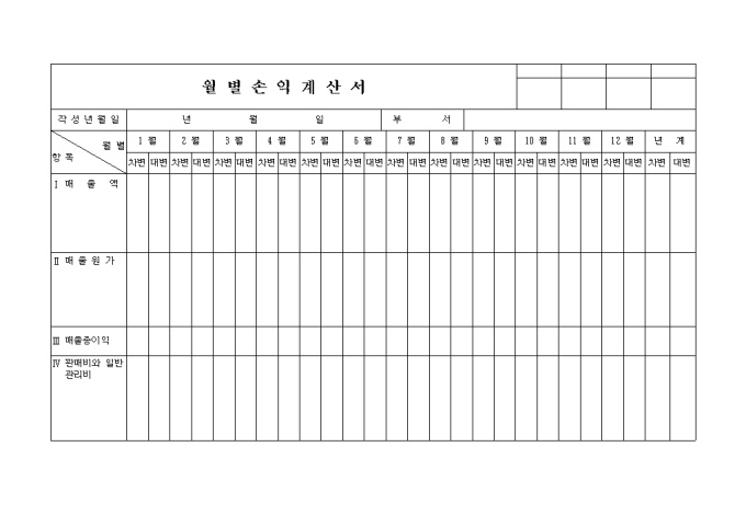 9,000원/월매출액, 매출원가, 매출총이익, 판매비와 일반관리비, 영업이익 등의 항목으로 나누어 손익금을 기록하는 월별손익계산서입니다.
