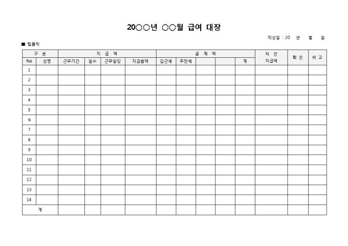 9,000원/월일용근로자급여대장입니다. 성명, 지급액, 공제액, 차인지급액, 확인, 비고 등의 항목으로 구성되어 있습니다.
