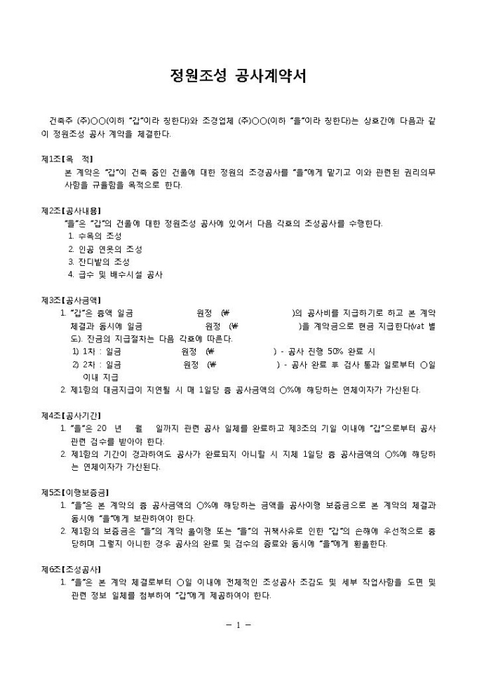 9,000원/월조경공사계약서입니다. 건축주와 조경업체 사이에 계약시 사용할 수 있는 계약서 양식입니다. 총 14개 항목으로 구성되어 있으며 13조 특약사항은 상황에 맞게 자유롭게 기입할 수 있습니다.