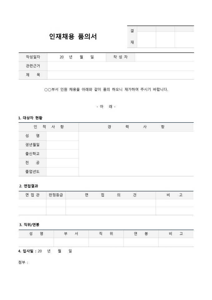 9,000원/월인재채용 품의서 입니다. 채용자 정보, 대상자 현황, 면접결과, 직위/연봉 등으로 구성되어 있습니다.
