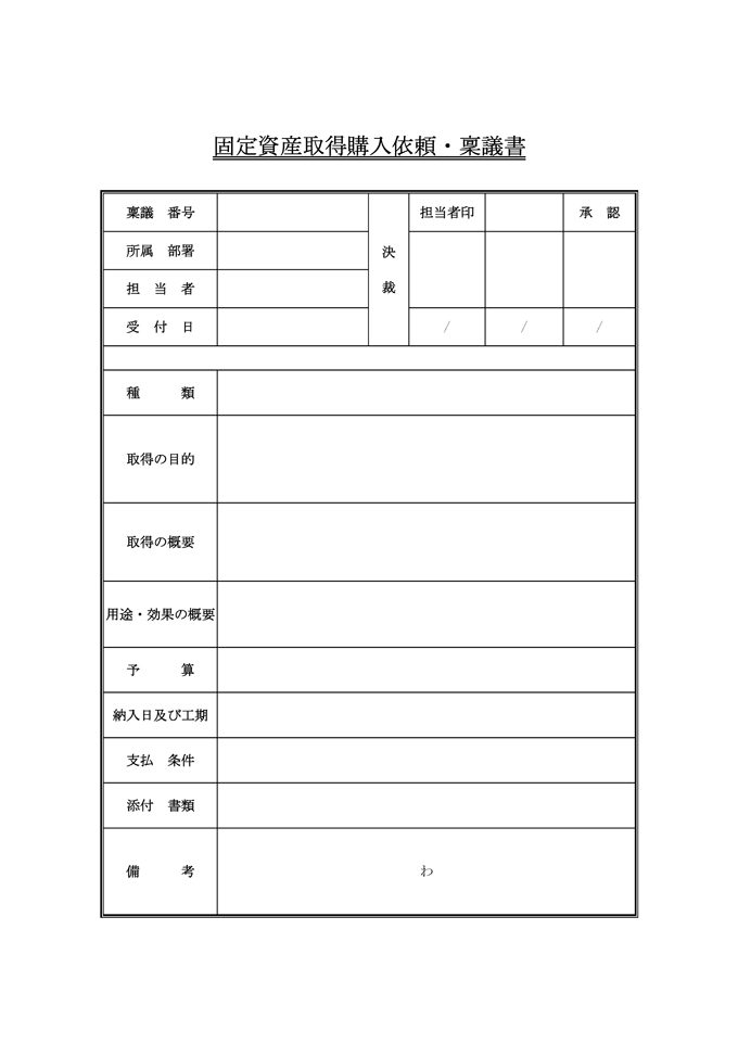 고정자산취득구입의뢰 품의서(일본어)입니다. 고정자산취득구입의뢰 품의서(일본어) 양식이 일본어로 작성된 문서양식입니다. 경리업무, 경리서식 분야에 활용할 수 있습니다. 고정자산취득구입의뢰 품의서(일본어) 양식