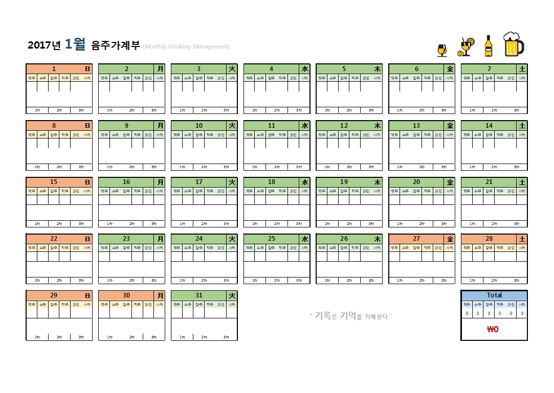 음주가계부(가계부, 달력가계부, 2017년가계부)입니다. A4 사이즈로 간편하게 출력해서 사용하실 수 있습니다.
