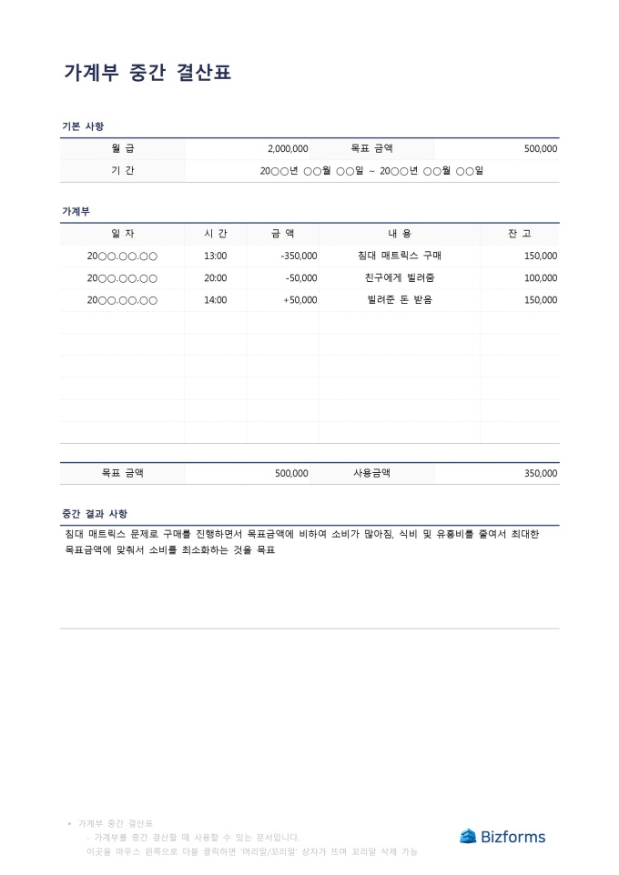 가계부 중간 결산표 입니다. 가계부의 사용량을 중간결과 형태로 확인, 체크 할 수 있는 문서입니다. 자신의 목표금액 및 사용금액을 확인하며 자금을 조율할 수 있습니다.