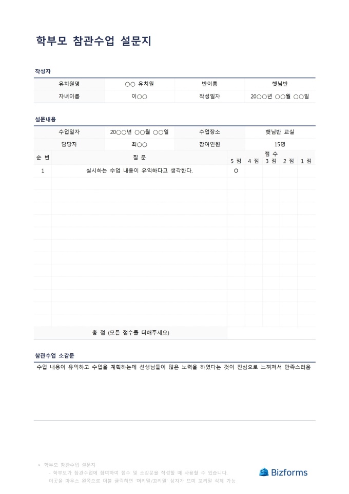 학부모 참관수업 설문지 입니다. 학부모가 자녀의 참관수업을 보고 작성하는 설문지 형태로 점수를 부여하고 소감을 작성할때 사용할 수 있습니다.