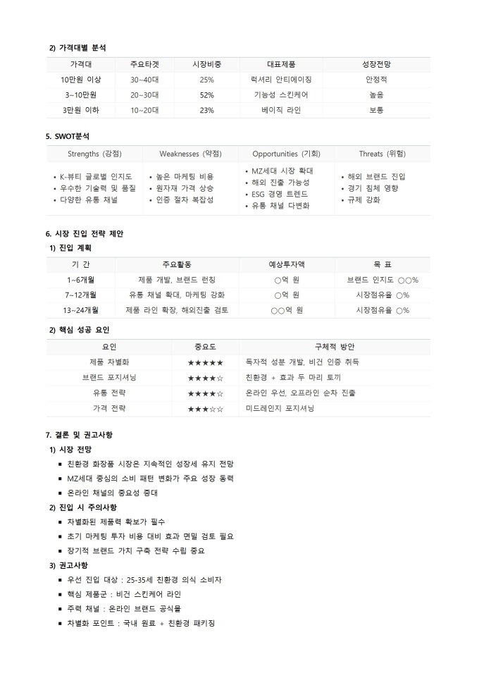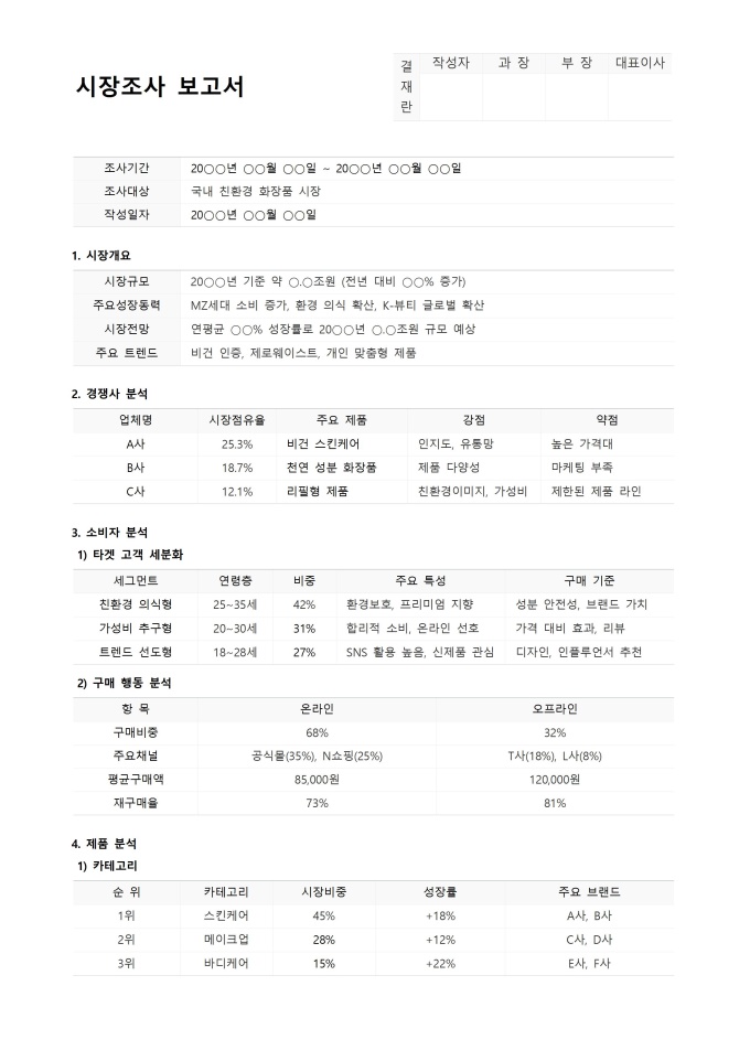 9,000원/월시장조사 보고서 서식입니다. 시장조사 보고서 서식은 시장 환경 분석을 통해 수집된 정보를 체계적으로 정리하고 전달하기 위한 문서 양식입니다. 이 서식은 주요 시장 동향, 경쟁사 분석, 소비자 행동 등 핵심 데이터를 효율적으로 시각화하여 사업 전략 수립에 필요한 객관적인 근거를 제공합니다.