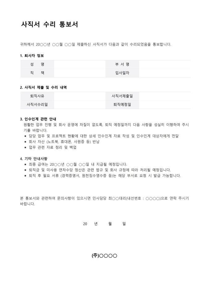 9,000원/월사직서 수리 통보서 서식입니다. 사직서 수리 통보서 서식은 퇴직 처리 절차를 명확히 하고, 사직일, 인수인계 관련 안내 등 필수 정보를 담아 직원과 회사 간의 오해를 방지하는 데 활용됩니다. 이를 통해 법적 분쟁의 소지를 줄이고 원활한 퇴직 절차를 진행할 수 있습니다.