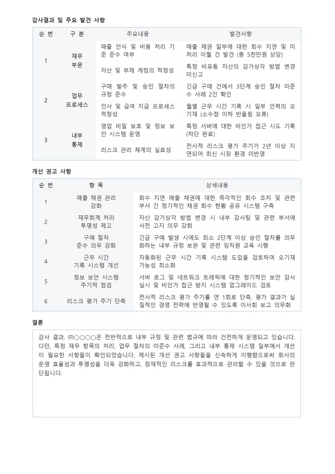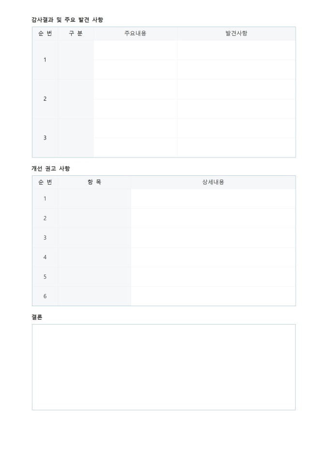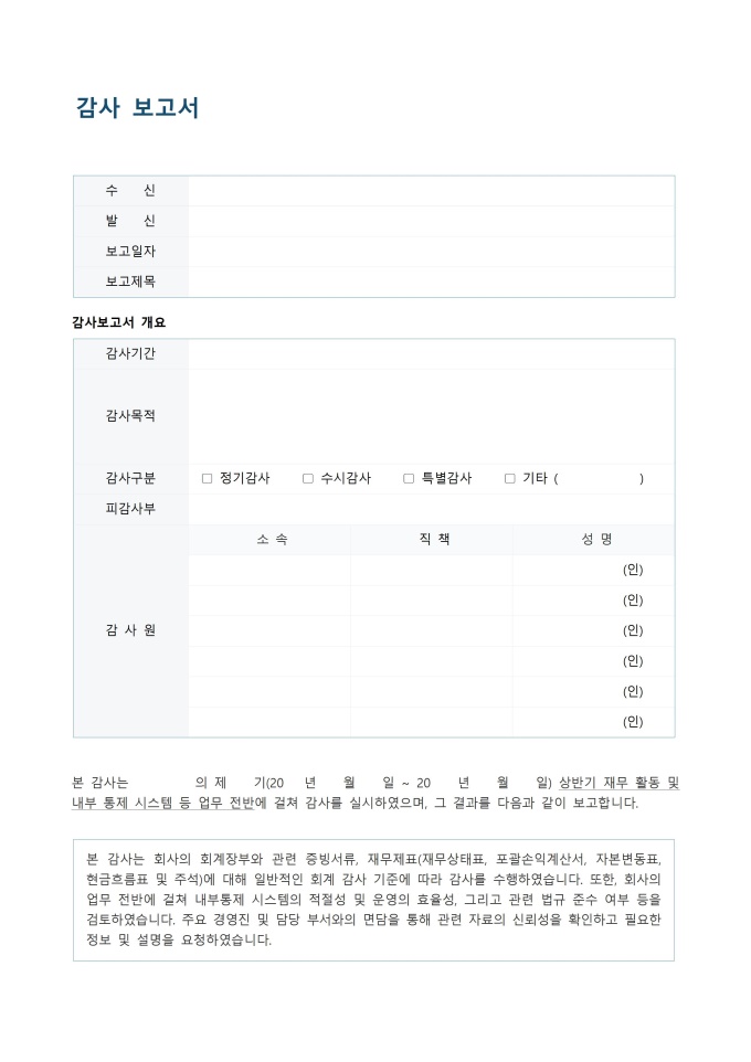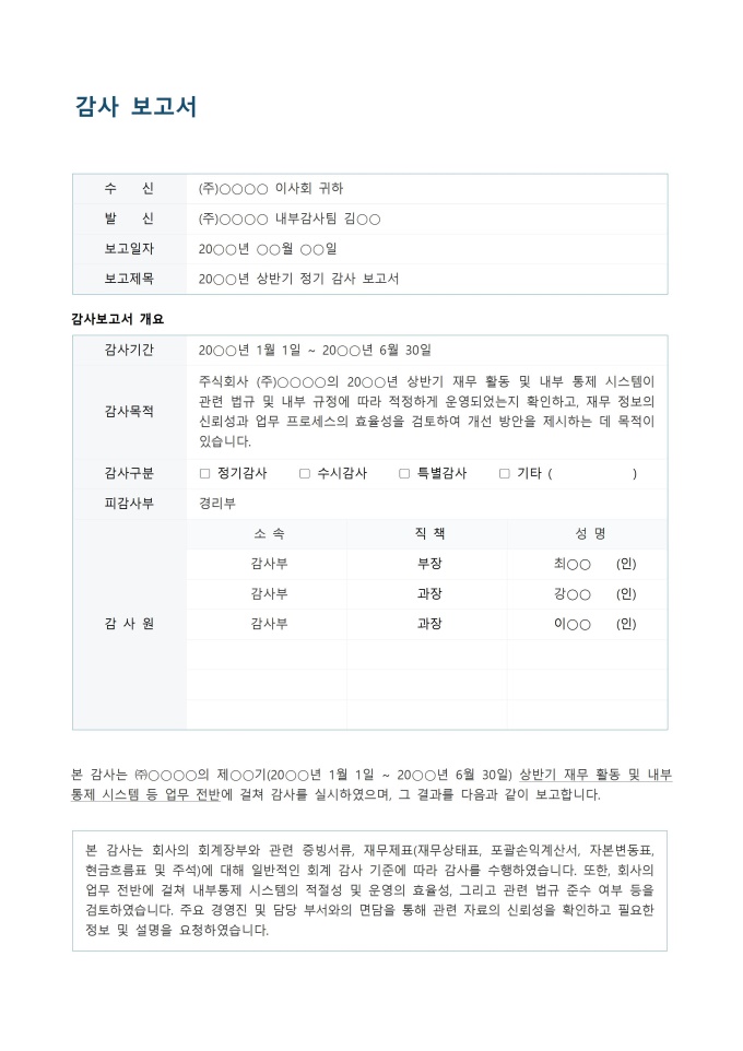 9,000원/월감사 보고서 서식입니다. 감사 보고서 서식은 조직의 재무 및 운영 상태를 독립적으로 평가하고 그 결과를 체계적으로 기록하는 표준 문서입니다. 이는 감사를 통해 발견된 문제점, 개선이 필요한 사항, 그리고 권고사항을 명확하게 제시하여 내부 통제의 효율성을 강화하고 투명성을 확보하는 데 필수적입니다.