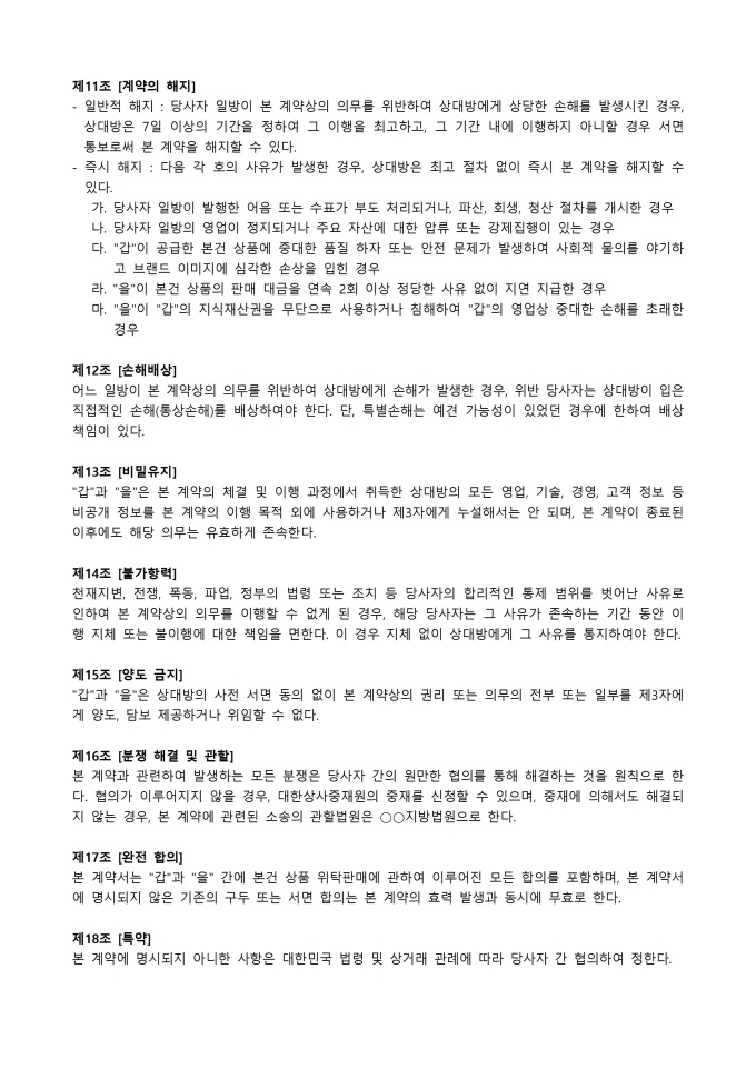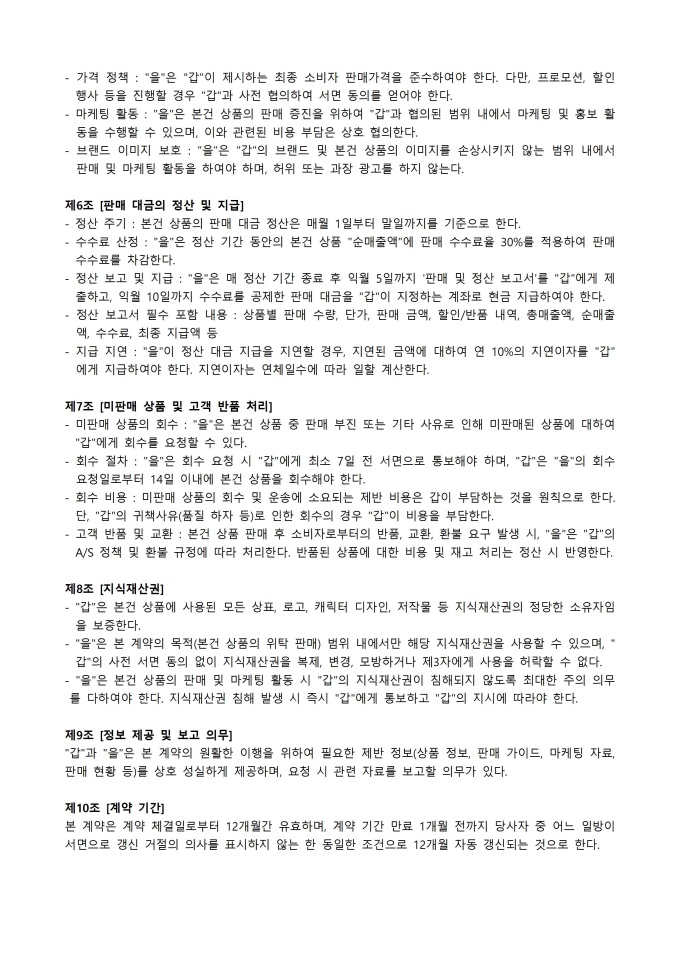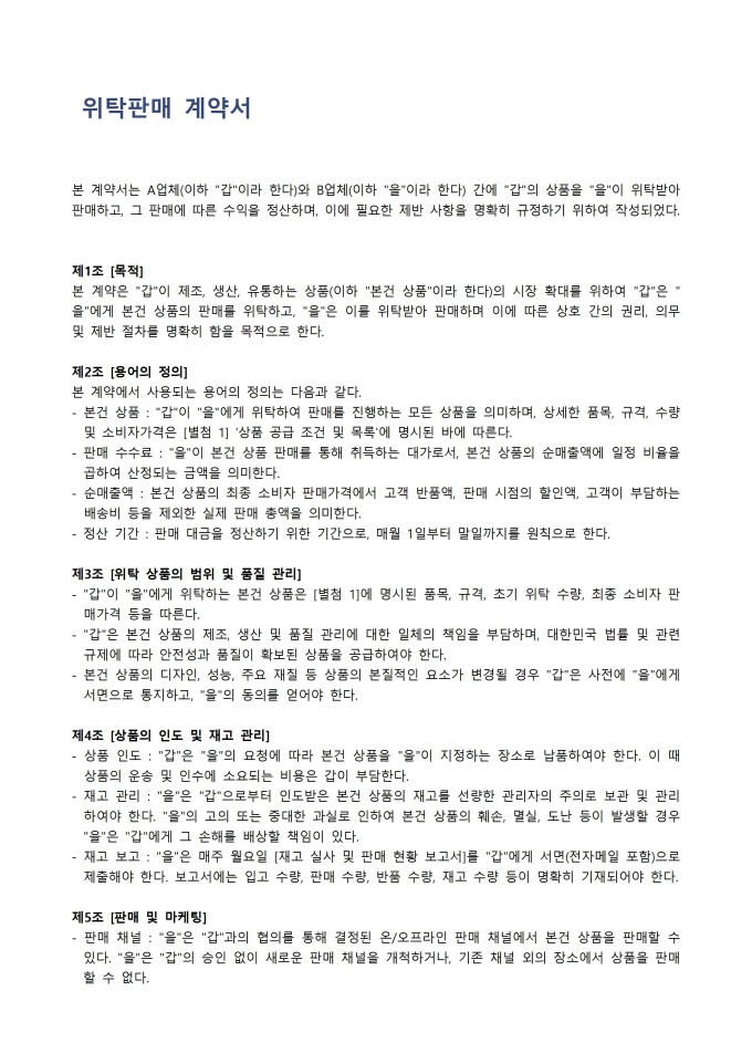 9,000원/월위탁판매 계약서 서식입니다. 위탁판매 계약서 서식은 위탁자와 수탁자 간의 위탁판매 관계를 명확히 규정하는 문서입니다. 이는 상품의 소유권은 위탁자에게 유지하면서 수탁자가 상품 판매를 대행하고, 판매된 수량에 대해 정산 및 수수료를 지급하는 내용을 포함합니다.