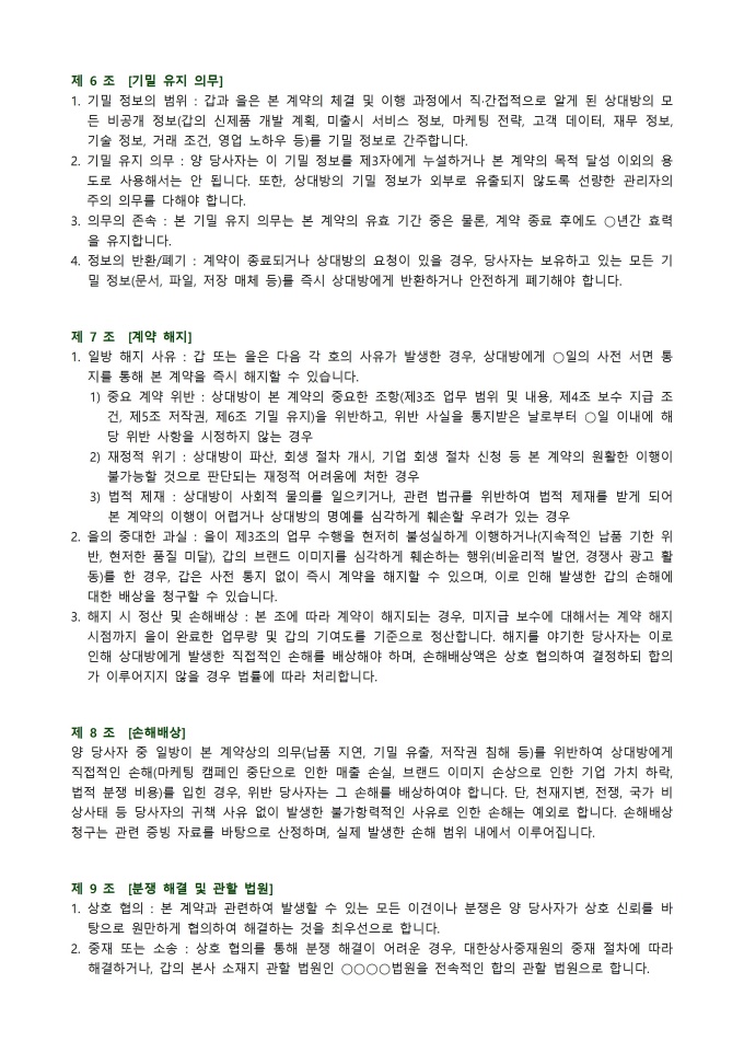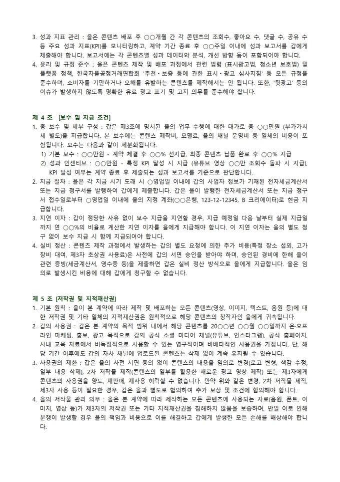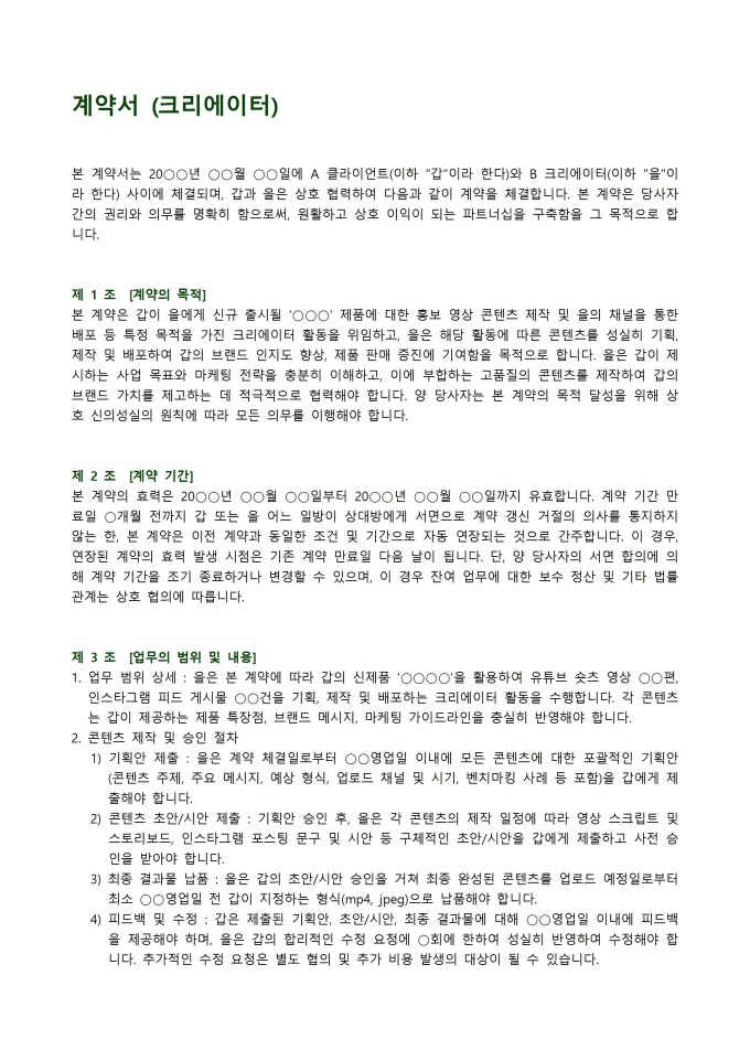 9,000원/월계약서 (크리에이터) 서식입니다. 계약서 (크리에이터) 서식은 창작자와 의뢰인 간의 협력 관계를 명확히 규정하고 상호 권리와 의무를 보호하기 위해 사용됩니다. 이는 콘텐츠 제작 범위, 지식재산권 소유 및 활용, 수익 배분 방식, 계약 기간 및 해지 조건 등 핵심 내용을 명시하여 분쟁을 예방합니다. 본 서식은 창작 활동의 법적 안정성을 확보하고 투명한 파트너십을 구축하는 데 필수적인 문서입니다.