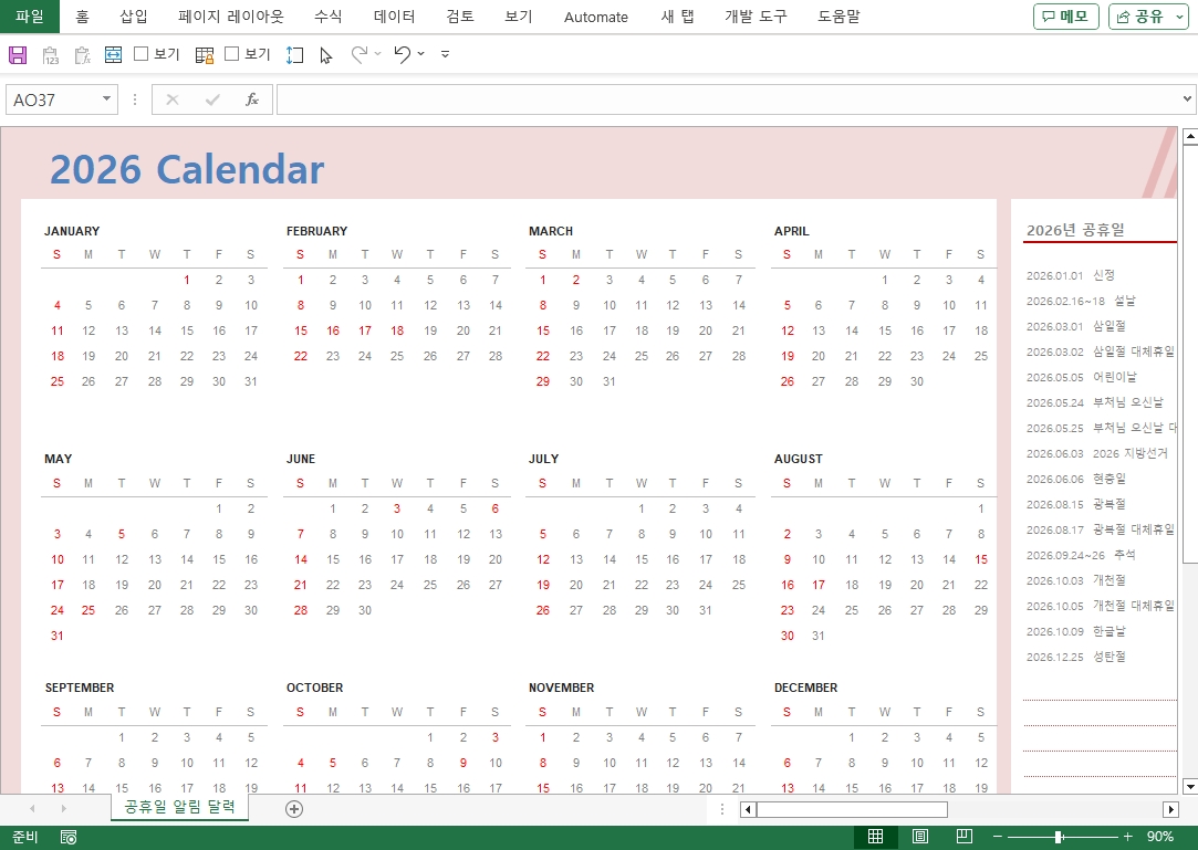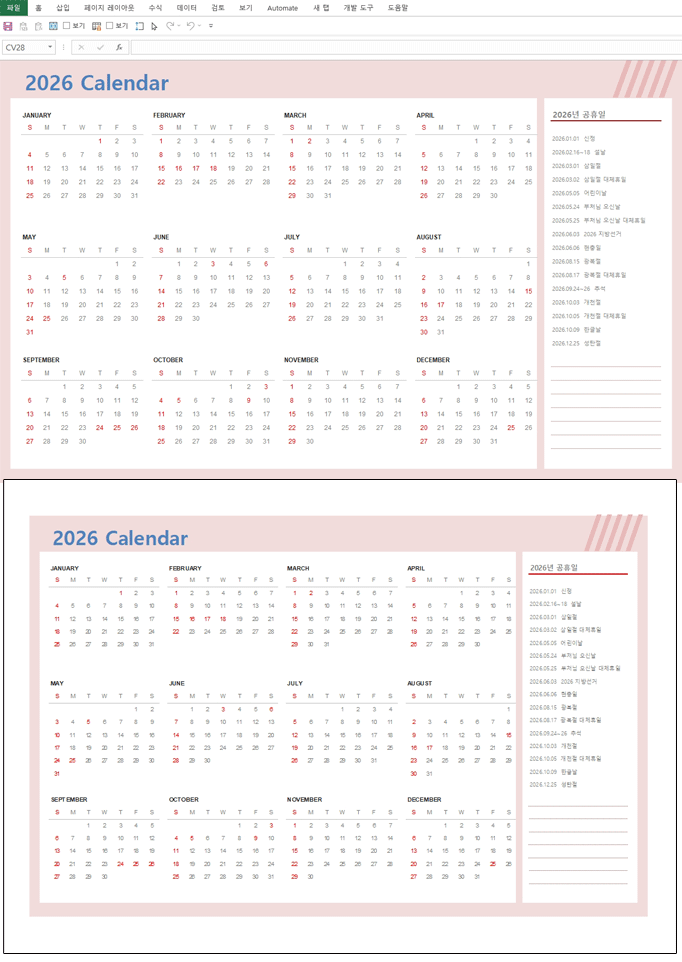 2026년 달력(연간일정,원페이지,공휴일 알림) 서식입니다. 2026년 엑셀 달력 서식은 연간 일정을 한눈에 파악할 수 있도록 디자인된 실용적인 도구로 이 달력은 원페이지 형태로 제작되어 전체적인 흐름을 쉽게 확인하고, 2026년의 중요한 공휴일 정보도 함께 제공하고 있습니다.