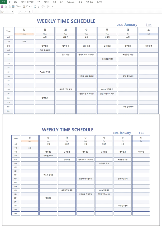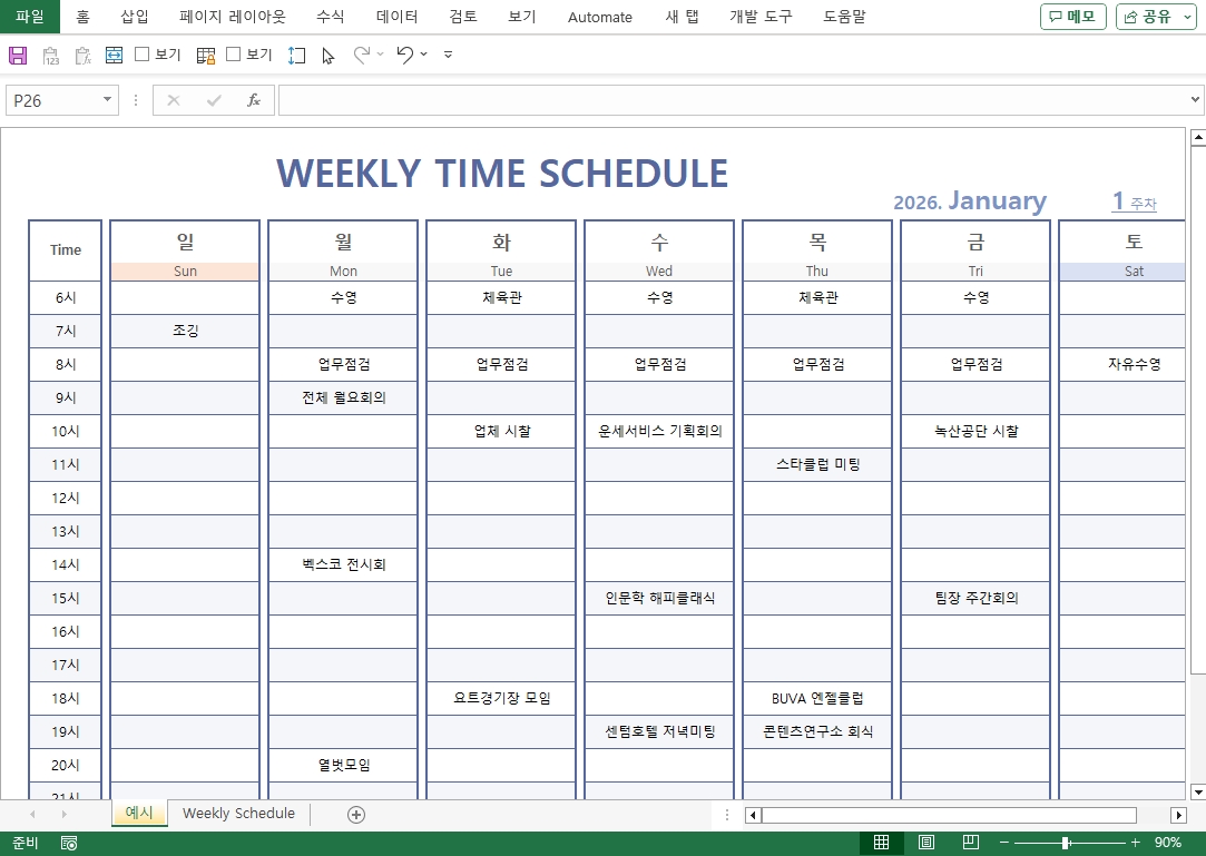 2026년 달력(주간일정,시간별스케줄관리) 서식입니다. 2026년 엑셀 달력 서식은 주간 단위의 일정을 상세히 관리할 수 있으며, 하루를 시간대별로 세분화하여 정밀한 스케줄 관리를 돕습니다. 미팅, 업무 배분, 개인 약속 등 모든 시간을 효율적으로 계획하고 실행할 수 있도록 지원합니다.