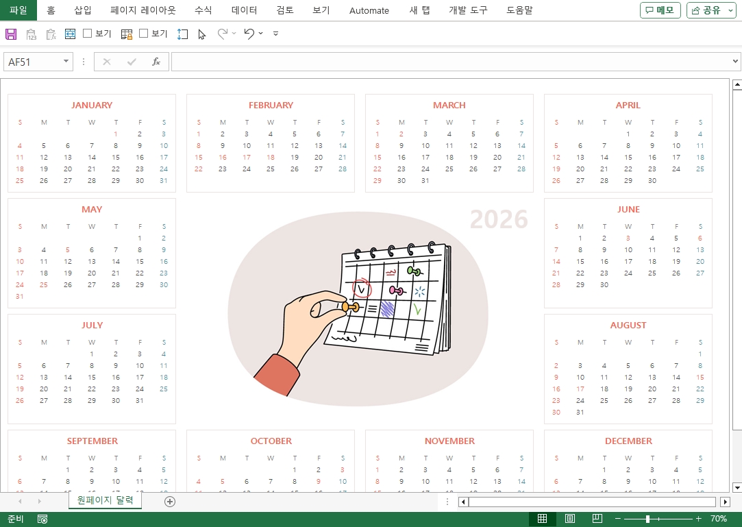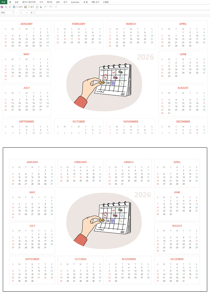 2026년 달력(연간일정,원페이지,심플이미지) 서식입니다. 2026년 엑셀 달력 서식은 전체 연간 일정을 한 페이지에 담아 효율적인 시각적 관리를 가능하게 합니다. 간결하고 세련된 심플 이미지 디자인이 적용되어, 사용자의 공간에 부담 없이 잘 어울리며 시각적인 편안함을 제공합니다. 복잡한 기능 없이 오직 핵심적인 일정 관리와 미니멀한 디자인에 집중하여, 일상에 깔끔한 효율성을 더해주는 실용적인 달력 서식입니다.