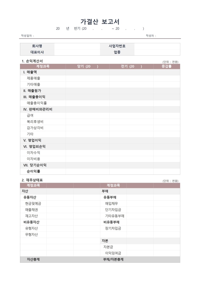 9,000원/월가결산 보고서 서식입니다. 가결산 보고서는 회계연도 중간에 일정 기간의 재무상태와 경영성과를 잠정적으로 집계하여 작성하는 내부 경영자료입니다. 주로 상반기나 분기별로 작성되며, 정식 결산 전에 경영진이 현재의 재무상황을 파악하고 향후 경영전략을 수립하는 데 활용됩니다.