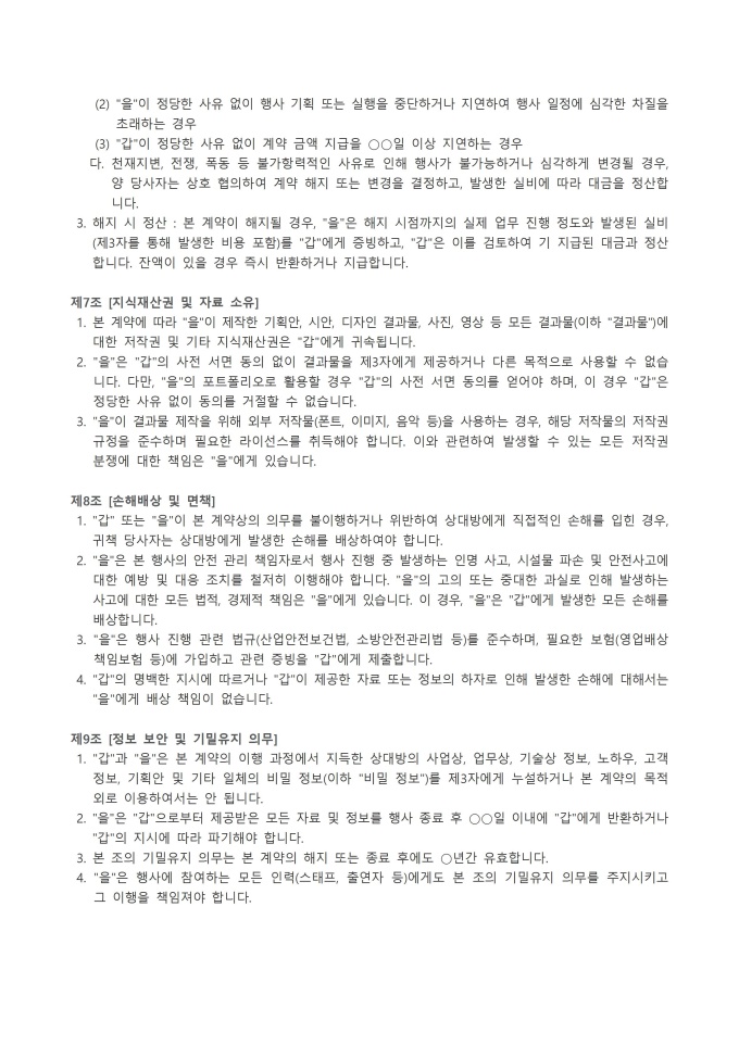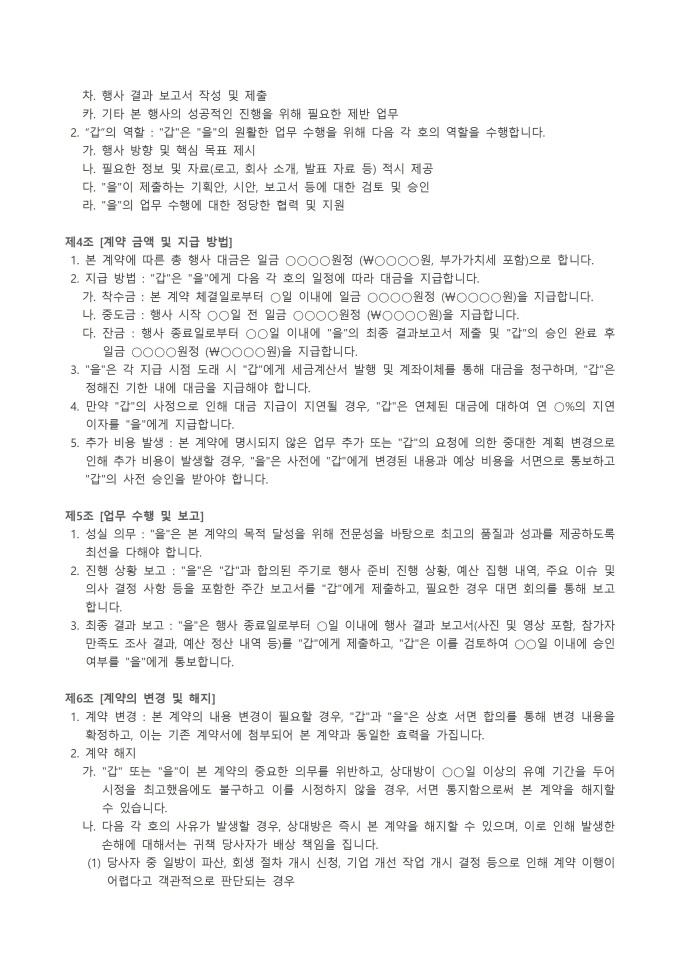 9,000원/월행사 진행 계약서 서식입니다. 행사 진행 계약서는 행사를 의뢰하는 측과 행사를 대행하는 업체 간의 약속을 명확히 하는 중요한 문서로 이 서식에는 행사 목적에 맞는 구체적인 프로그램 내용과 대행 업무 범위, 그리고 필요한 안전 조치 사항들이 상세하게 명시되어야 합니다. 특히, 행사 비용과 지급 방식, 계약 해지에 관한 조항, 그리고 손해배상과 같은 핵심 내용을 정확하게 기재하여 차후 발생할 수 있는 분쟁을 효과적으로 예방하는 데 도움을 줍니다.