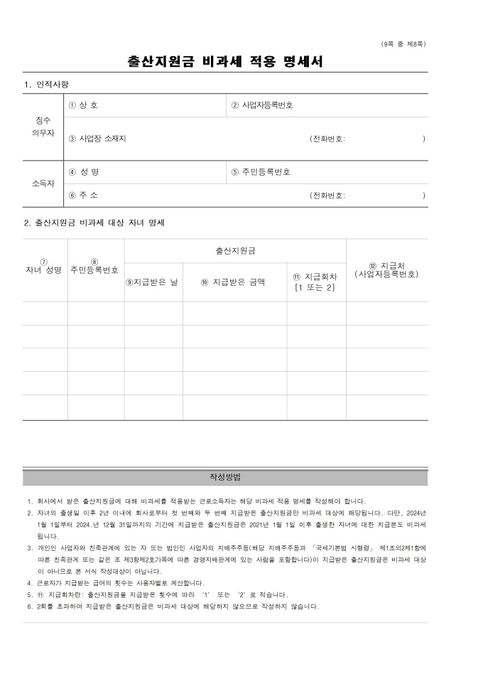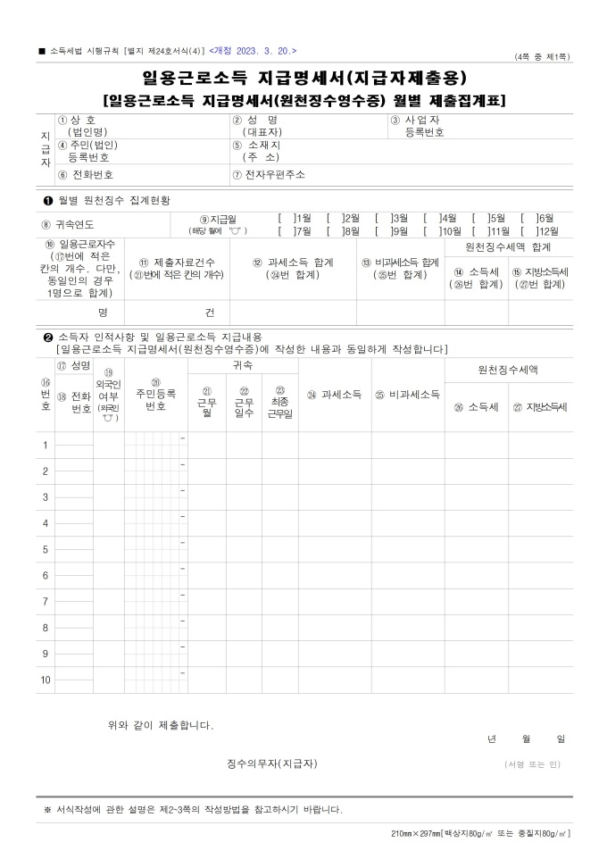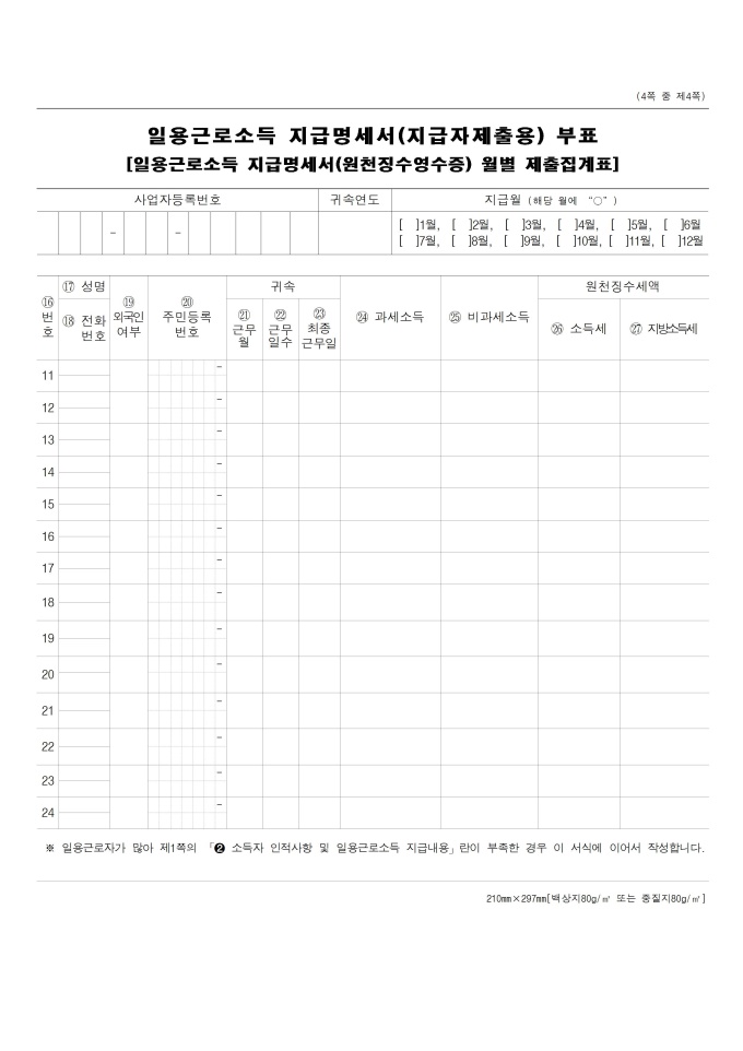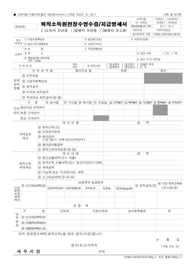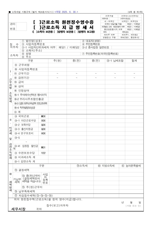 9,000원/월근로소득 원천징수영수증, 근로소득 지급명세서, 퇴직소득원천징수영수증_지급명세서, 일용근로소득 지급명세서(원천징수영수증), 일용근로소득 지급명세서, 연금소득 원천징수영수증(연말정산용), 연금소득 지급명세서(연말정산용) 서식입니다. 소득세법 시행규칙 [별지 제24호서식(1)] [개정 2025. 6. 30.]