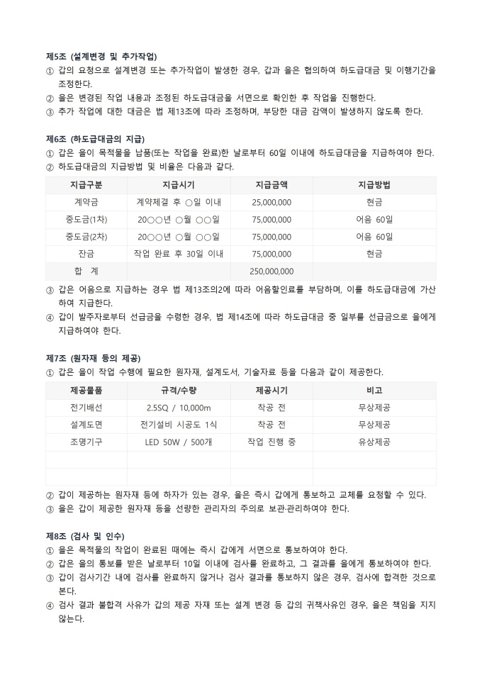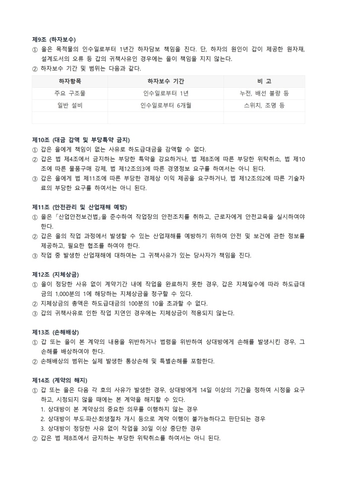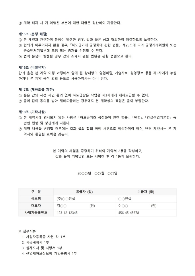 9,000원/월하도급 계약서 서식입니다. 어떤 사업의 일부분을 원도급자가 다른 사업자에게 위임하여 처리하도록 하는 계약을 문서화한 것으로 주로 건설, 제조, 용역 등의 분야에서 흔히 사용되며, 원도급자와 하도급자 간의 업무 범위, 대금, 책임 등을 명확히 규정하여 상호 간의 분쟁을 예방하고 공정한 거래 질서를 유지하기 위한 목적으로 사용됩니다.