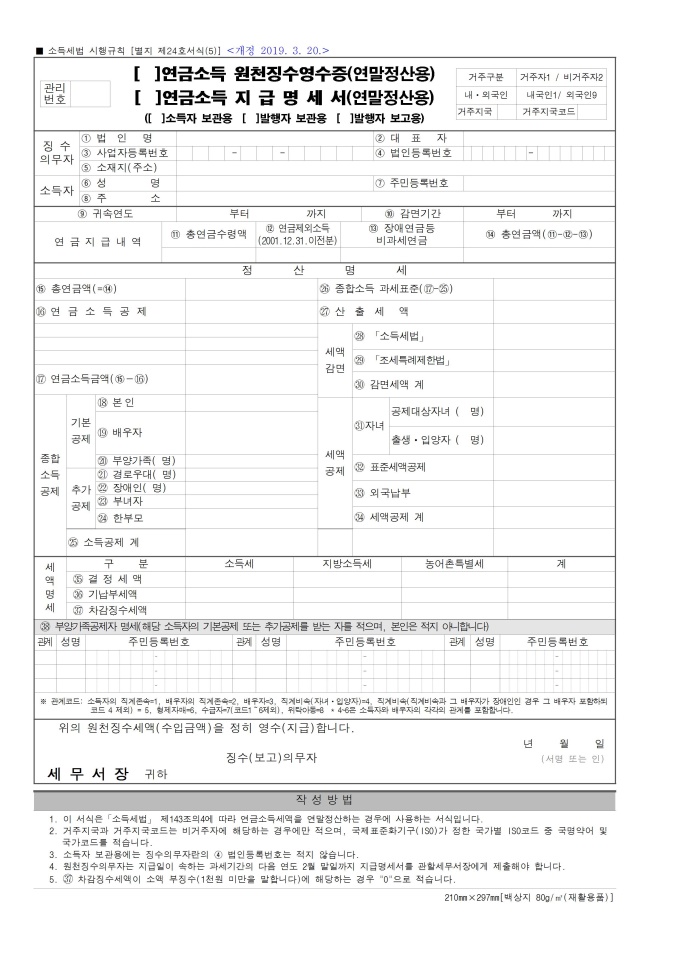 9,000원/월연금소득 원천징수영수증, 연금소득 지급명세서 서식입니다. 소득세법 시행규칙 [별지 제24호서식(5)] <개정 2019. 3. 20.>