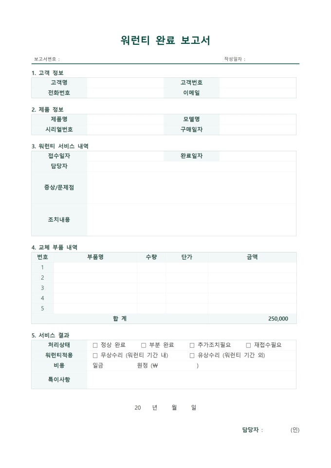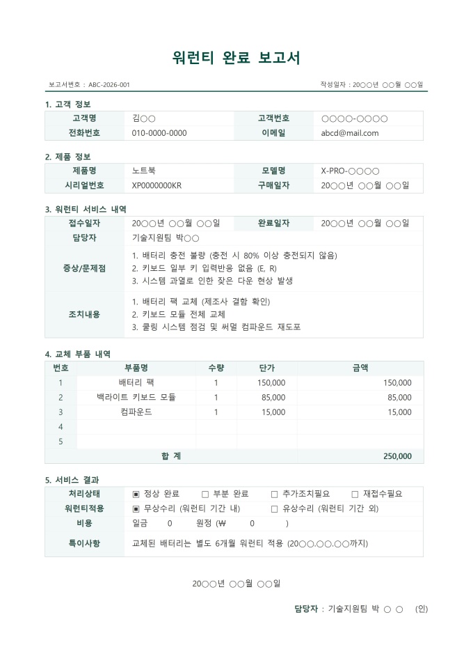 9,000원/월워런티 완료 보고서 서식입니다. 워런티 완료 보고서는 제품이나 서비스에 대한 보증(Warranty) 기간 중 발생한 문제에 대해 고객에게 제공된 수리, 교환, 점검 등의 서비스가 성공적으로 완료되었음을 기록하는 서식입니다. 이 서식은 고객에게 서비스 내역을 투명하게 제공하여 신뢰를 높이고, 내부적으로는 워런티 서비스 이력을 체계적으로 관리하며 제품 품질 개선의 중요한 자료로 활용됩니다.