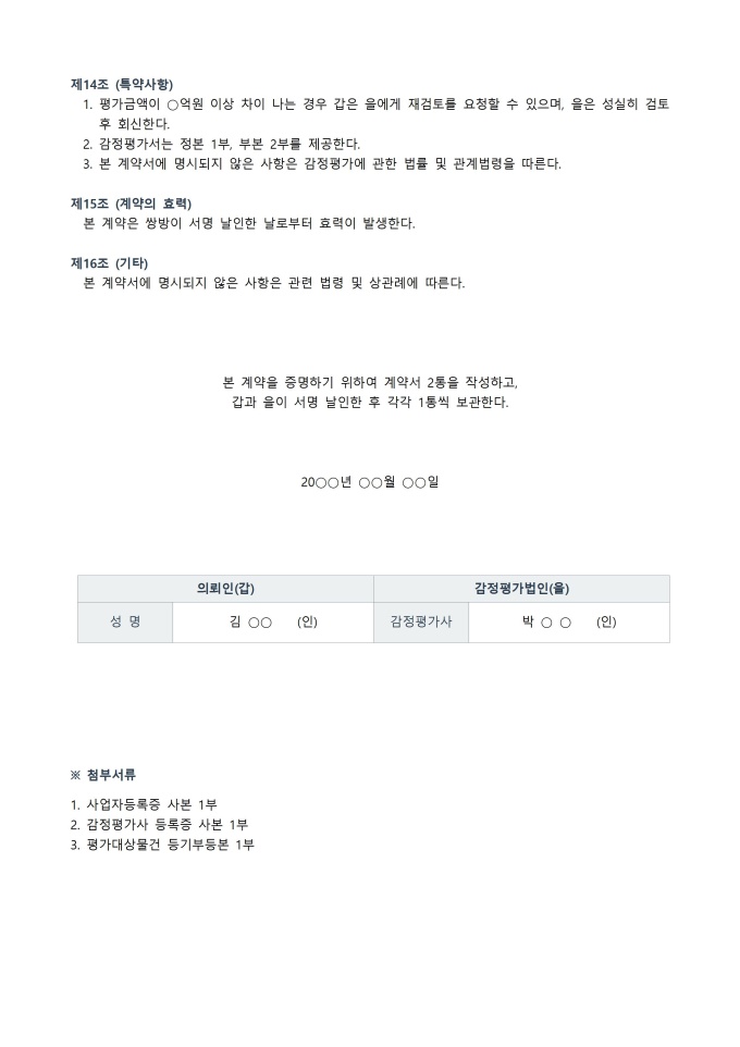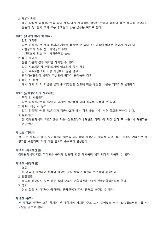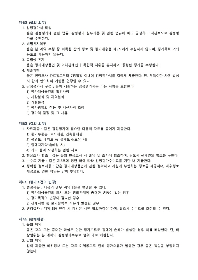 9,000원/월감정평가 계약서 서식입니다. 감정평가 계약서는 부동산이나 기타 자산의 가치를 객관적으로 평가하기 위해 의뢰인과 감정평가사 또는 평가기관 간에 체결하는 공식 문서입니다. 본 계약서는 평가 대상, 평가 목적, 계약 기간과 대금, 비밀 유지 조항, 책임과 권리 의무, 분쟁 해결 방식 등을 명확히 규정하여 양측의 권리와 의무를 보호합니다. 이를 통해 평가 업무가 투명하고 공정하게 이루어지도록 하며, 계약 내용에 따른 업무 수행과 결과 제출이 체계적으로 진행될 수 있도록 하는 역할을 합니다.