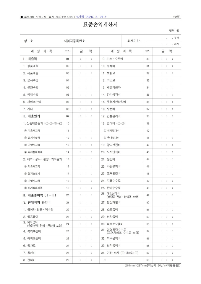 9,000원/월표준손익계산서 서식입니다. 표준손익계산서는 기업회계기준을 준용하여 작성해야 합니다. 소득세법 시행규칙 [별지 제40호의7서식] <개정 2025. 3. 21.>