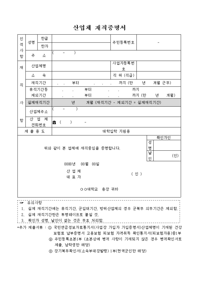 산업체 재직 증명서 양식입니다. 인적사항 및 재직사항 등을 기재합니다.