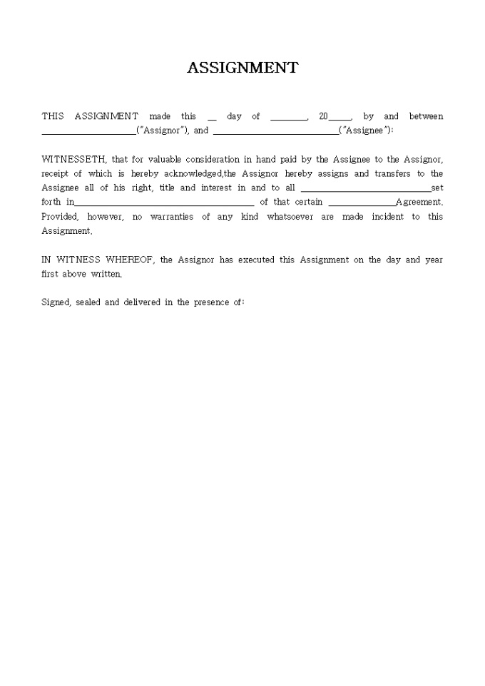 9,000원/월아래는 ASSIGNMENT의 내용중 일부입니다. WITNESSETH, that for valuable consideration in hand paid by the Assignee to the Assignor, receipt of which is hereby acknowledged, the Assignor hereby assigns and transfers to the Assignee all of his right, title and interest in