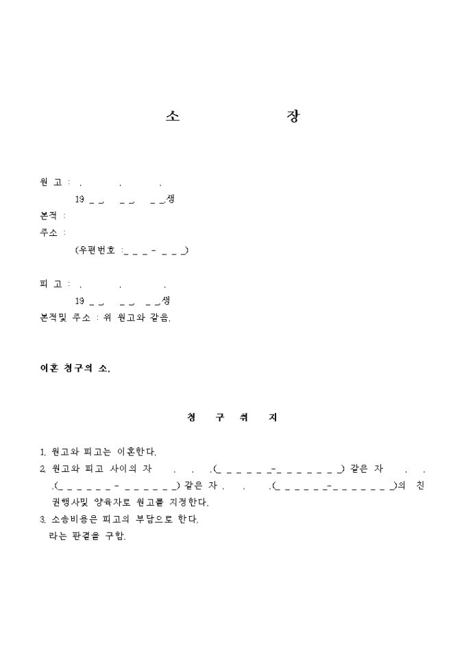 9,000원/월이혼소장 입니다. 청 구 취 지 1. 원고와 피고는 이혼한다. 2. 원고와 피고 사이의 자 . . .(_ _ _ _ _ _-_ _ _ _ _ _ _) 같은 자 . . .(_ _ _ _ _ _ - _ _ _ _ _ _) 같은 자 . . .(_ _ _ _ _ _-_ _ _ _ _ _ _)의 친권행사 및 양육자로 원고를 지정한다. 3. 소송비용은 피고의 부담으로 한다. 라는 판결을