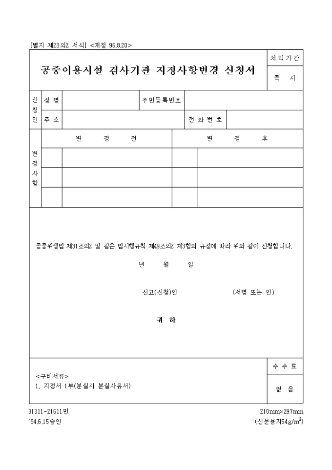 공중위생법 제31조의2 및 같은 법시행규칙 제49조의2 제3항의 규정에 따라 위와 같이 신청할 때 사용하는 공중이용 시설 검사기관 지정사항 변경신청서 양식입니다.