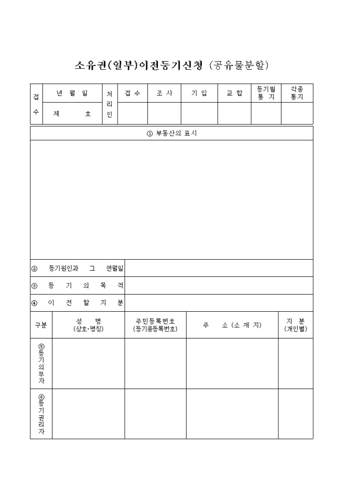 소유권(일부)이전등기신청(공유물분할) 입니다. ① 부동산의 표시 ② 등기원인과 그 연월일 ③ 등 기 의 목 적 ④ 이 전 할 지 분 ⑤ 등 기 의 무 자 ⑥ 등 기 권 리 자 ... 의 항목으로 구성된 소유권(일부)이전등기신청(공유물분할) 입니다.