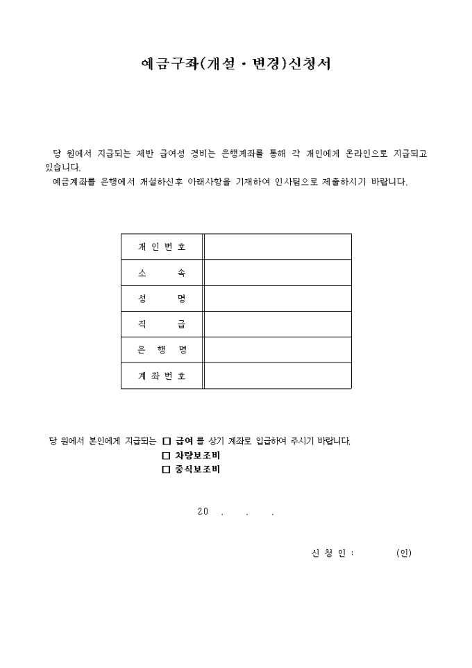 개인번호, 소속, 성명, 직급, 은행명, 계좌번호로 구성되어 있는 예금구좌(개설·변경)신청서입니다.