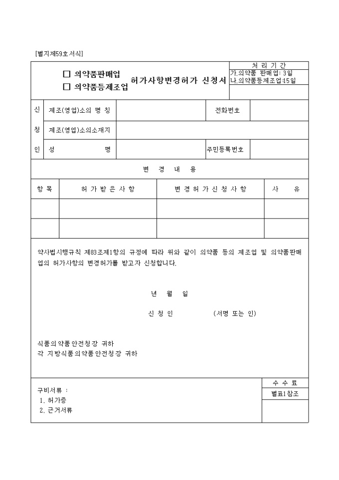 (의약품판매업, 의약품등제조업)허가사항변경허가신청서