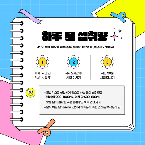 매일의 물 섭취 목표를 설정하고 그에 따라 기록하고 체크해 보는 건 어떨까요?