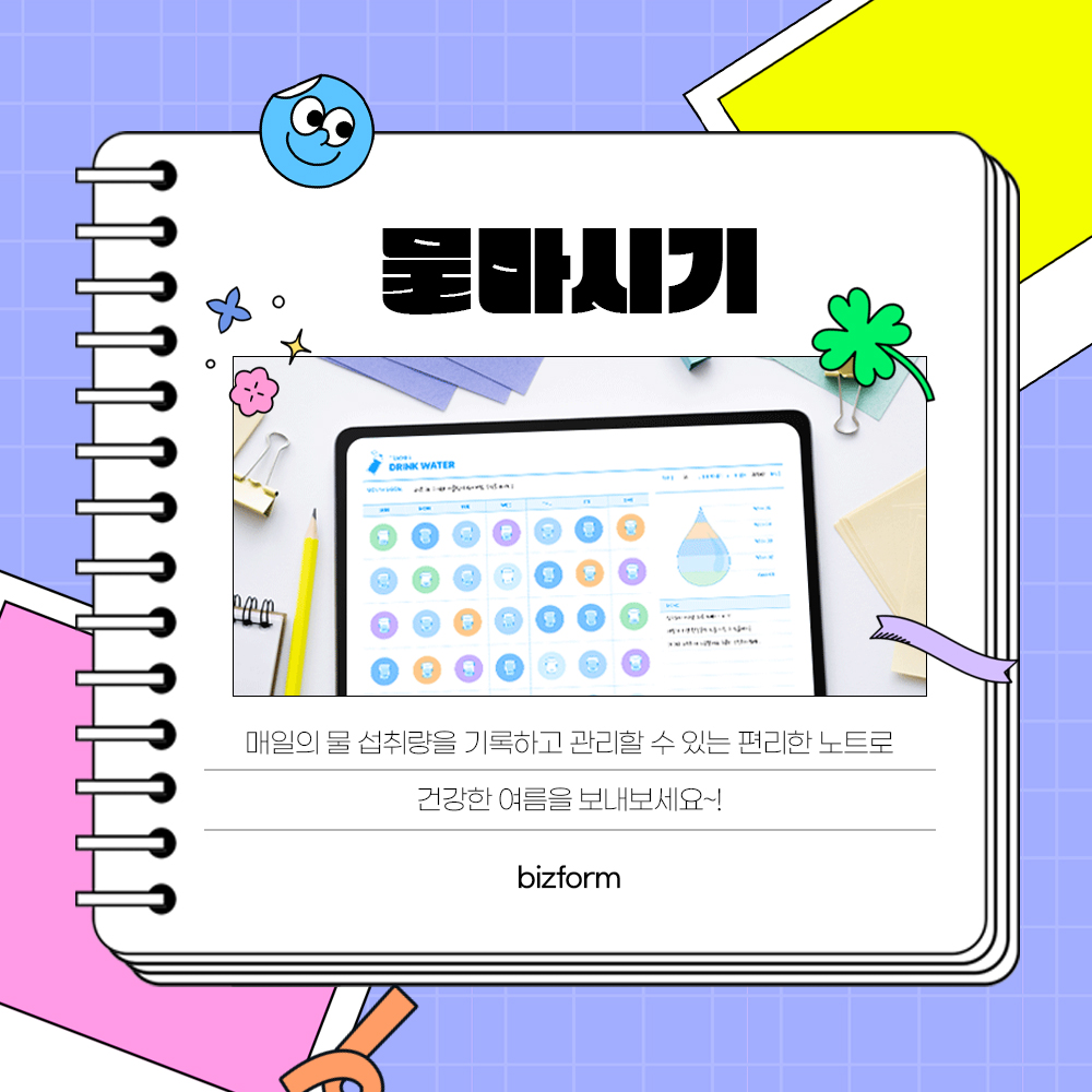 여름은 더욱 높아진 기온으로 인해 더 많은 수분 공급💧이 필요하고 건강을 유지하기 위해서는 충분한 물 섭취가 중요합니다. 일일 물 섭취량을 효과적으로 관리하고 건강한 생활 습관을 만들기 위해 디자인된 편리한 노트에 물을 마시는 습관을 길러보고 기록해 보는 건 어떨까요?✏️