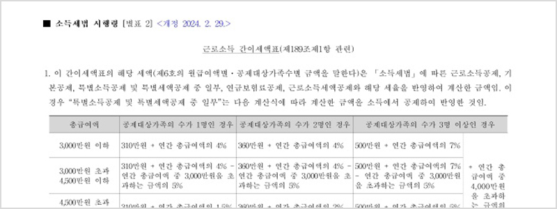 ◾ 일반 근로자는 월 급여와 부양가족 수에 따라 소득세가 달라지고 근로소득 간이세액표에 따라 징수됩니다.