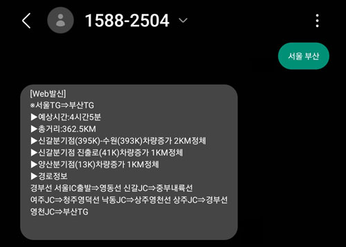 고속도로 이용 시 1588-2504 번호로 ‘출발지 도착지’의 형태로 문자를 발송하면 1~2분 내에 문자로 예상시간, 총거리, 경로 그리고 차량 정체 정보를 문자로 답변 받을 수 있습니다. 출발지와 도착지를 보내실 때는 사이에 한 칸을 띄워서 발송해 주시면 됩니다.