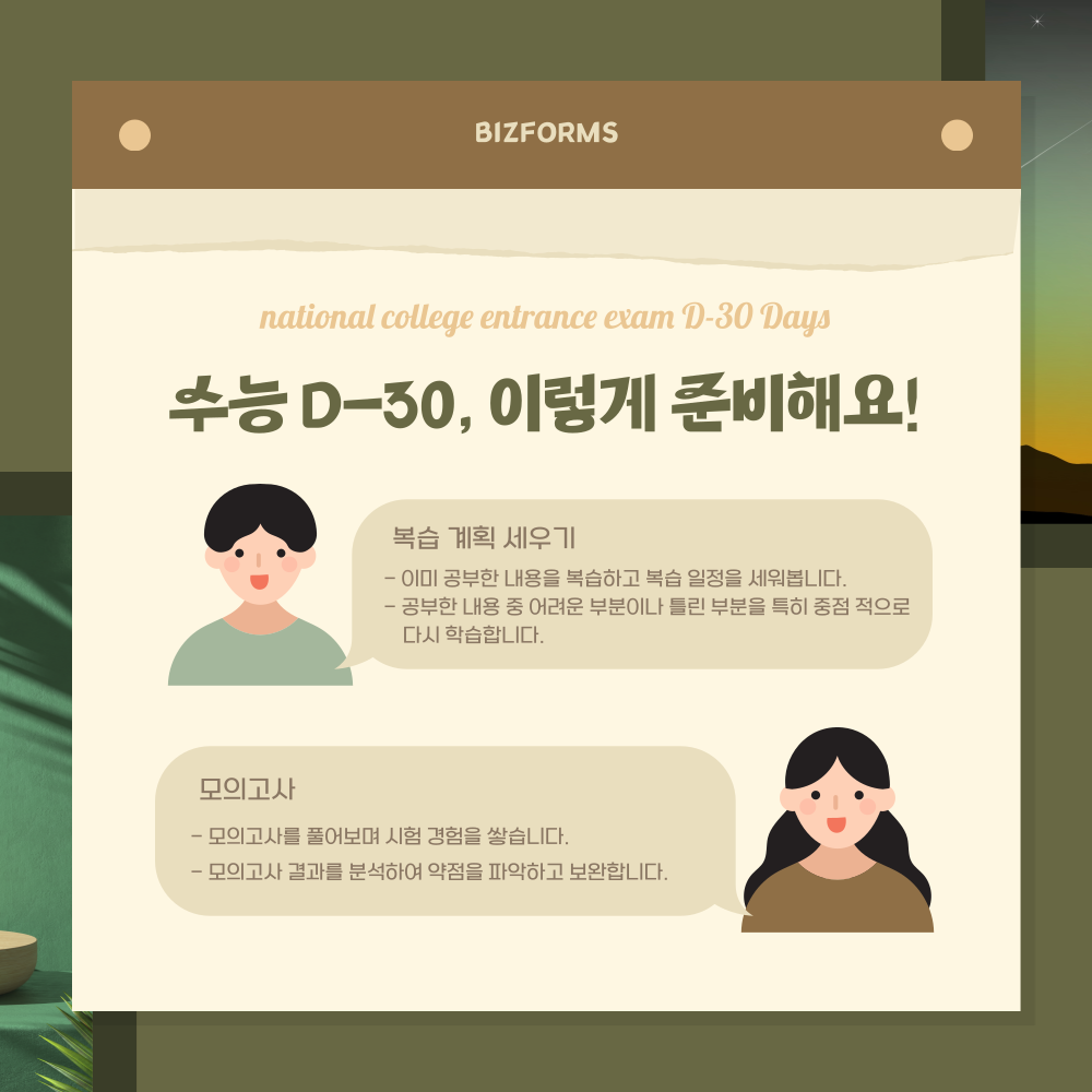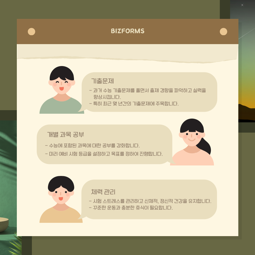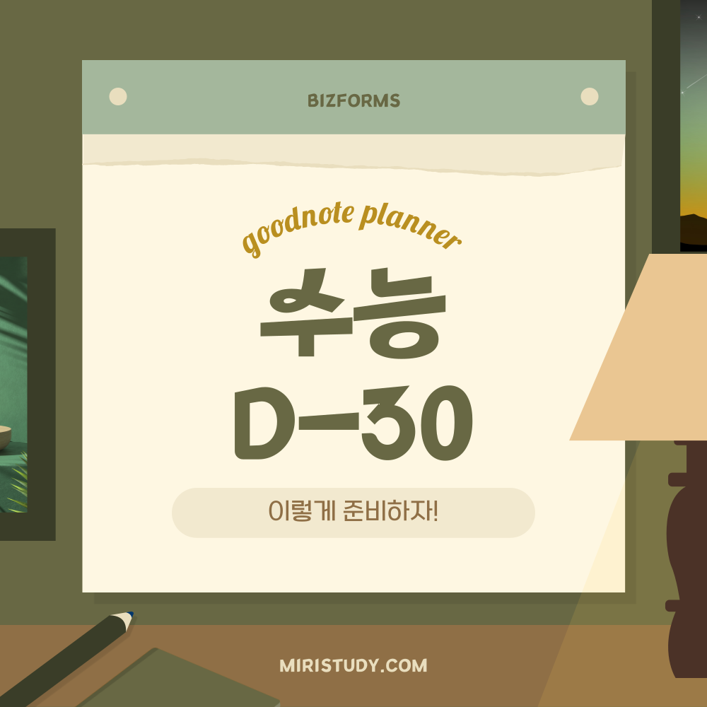 무작정 공부를 시작하게 된다면 나중에 무엇을 공부해야 하고 부족한 과목이 무엇인지 헷갈리게 됩니다. 이러한 문제를 방지하기 위해서는 기록하는 습관을 기르는 것도 수능 관리에 필요한 부분입니다. 곧 다가오는 수능을 대비하여 남은 기간 동안 비즈폼이 무료로 제공하는 스터디 플래너를 활용하여 나의 공부 계획을 기록해 보세요!