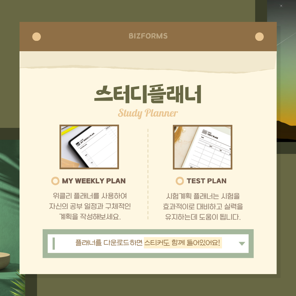 플래너(MY WEEKLY PLAN, TEST PLAN) 파일을 다운로드하면 스티커도 함께 들어있어요! 마지막 한 달, 목표를 놓지 마시고 최선을 다해 준비하세요. 비즈폼은 항상 수험생 여러분들을 응원합니다. 수능에서 최고의 성적을 얻기를 바랍니다! 🌟💯