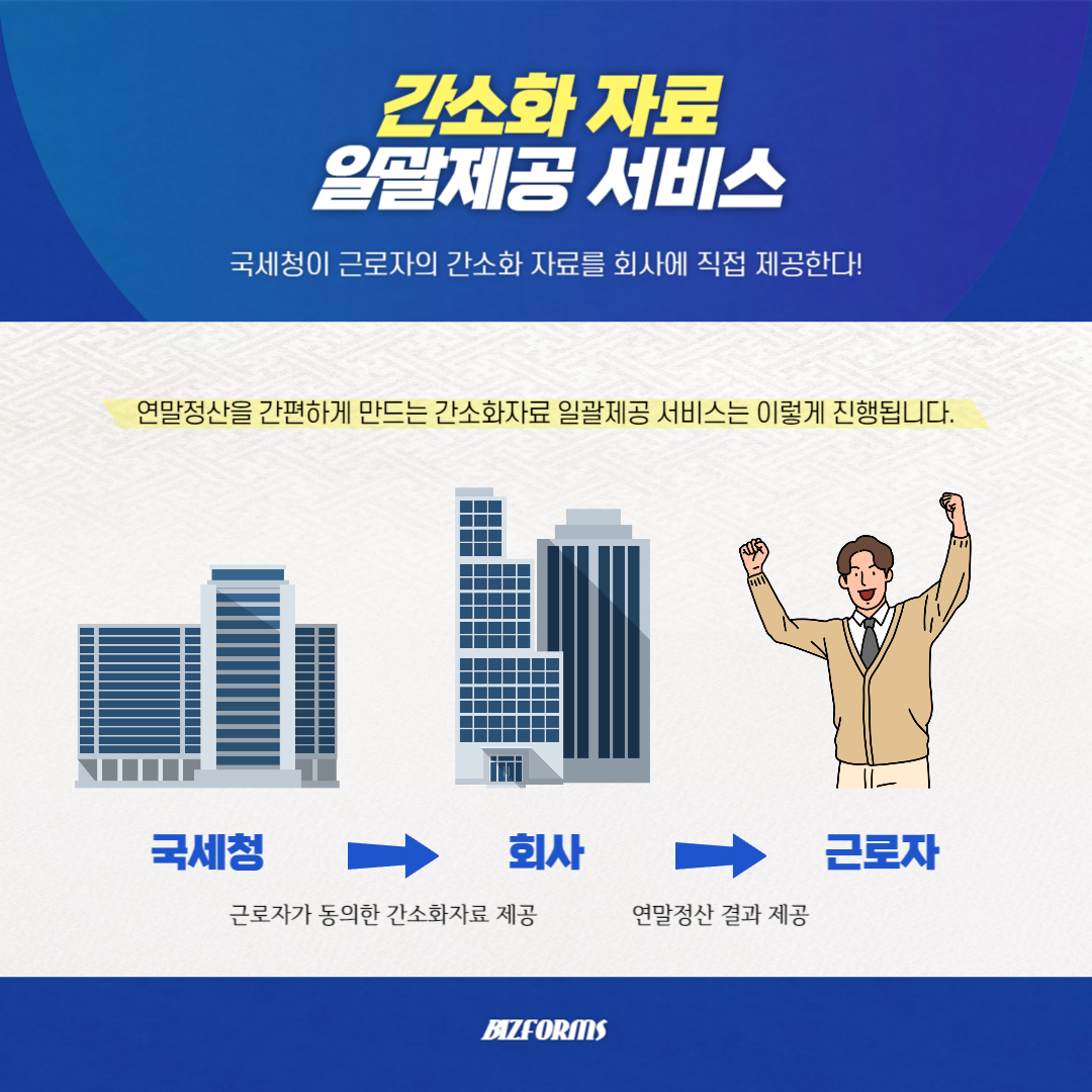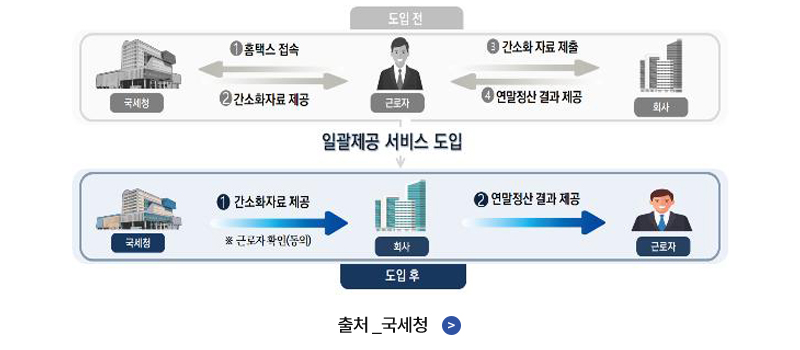 바로 간소화자료 일괄제공 서비스입니다. 전면으로 도입되어 국세청이 근로자의 간소화 자료를 회사에 직접 제공하는 서비스를 이용할 수 있습니다. 국세청이 부양가족을 포함한 근로자의 간소화 자료를 회사에 직접 제공함에 따라 보다 쉽고 간편하게 연말정산을 할 수 있습니다.