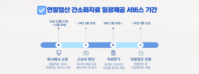 24년 1월 20일부터 일괄제공에 동의한 근로자의 간소화 자료를 회사에 제공하고, 회사는 자료를 받아 연말 정산을 진행합니다.