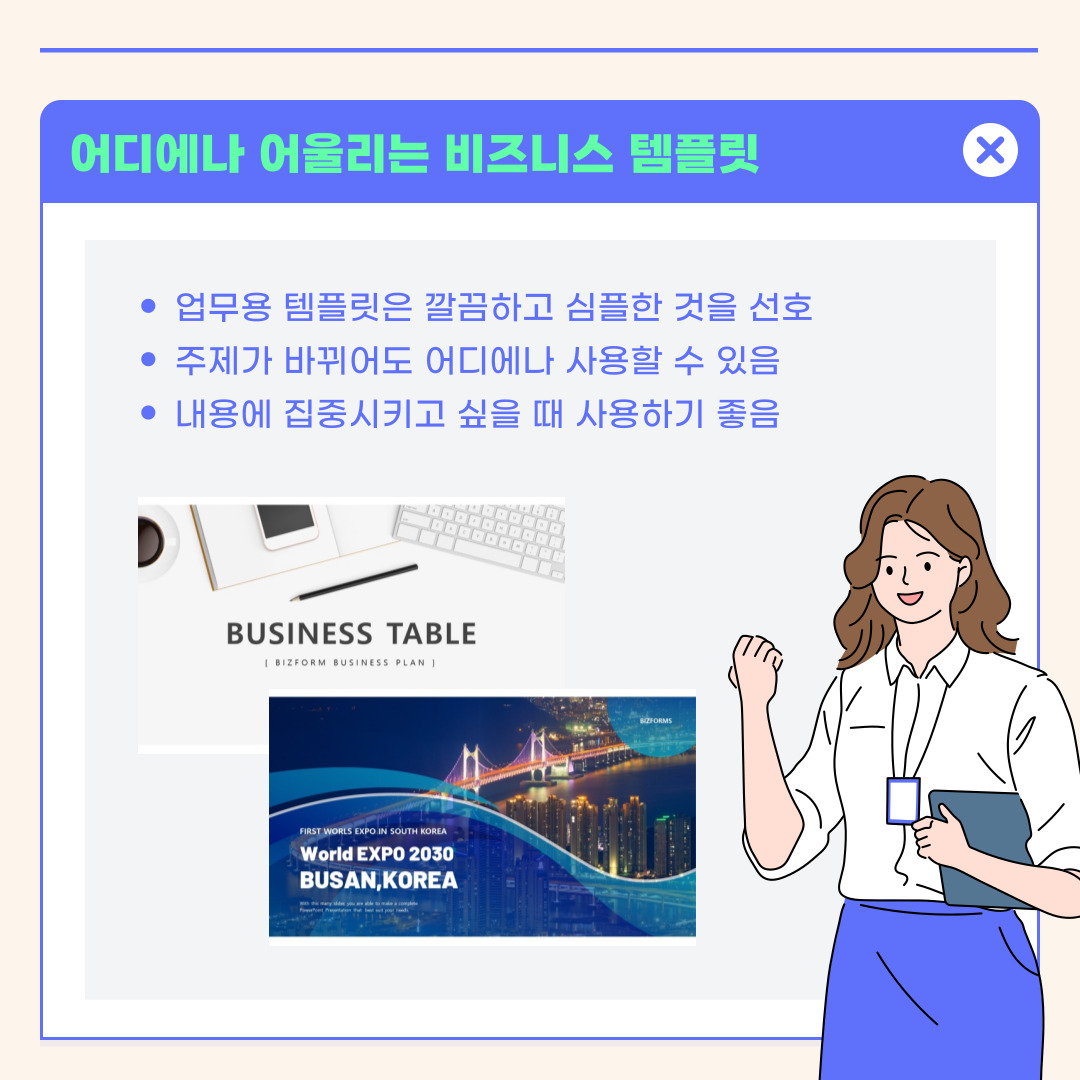 더불어 중요한 것이 바로 템플릿 디자인일 것입니다. 산업별로 특화되어있는 디자인과 구성으로 프레젠테이션의 전문성을 높여주며 주제를 사진이나 아이콘 등으로 표현하면 글만으로 전달하는 것보다 더 임팩트 있는 메시지를 전달할 수 있습니다. 산업별 특성이 잘 나타나 있는 비즈폼 추천 템플릿 디자인을 만나보세요.