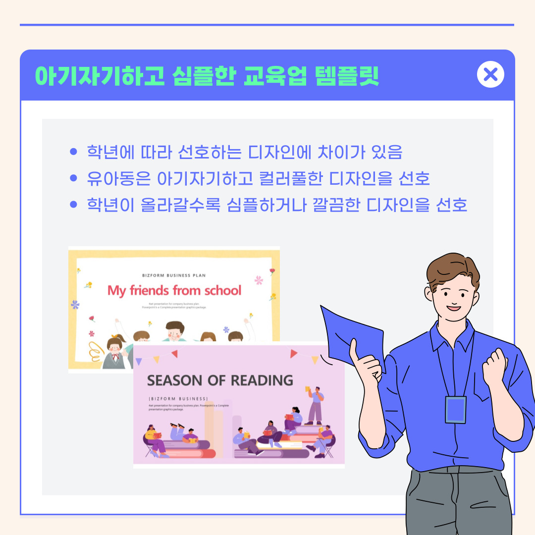 학교에서 과제나 발표, 세미나 등 다양하게 활용되는 템플릿은 다른 산업과는 다르게 초/중/고/대학교 단계에 따라 선호하는 디자인에 차이가 있습니다. 유/아동 분야는 아기자기하고 컬러풀한 디자인을 선호하고 학년이 올라갈수록 심플하거나 깔끔한 디자인을 찾게 되는데요. 단계별 추천 템플릿 같이 보실까요?