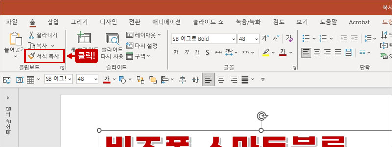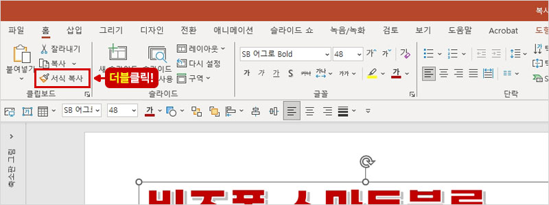 1️⃣ 복사하려는 개체 선택 후 [홈] – [서식복사] 메뉴 더블클릭
