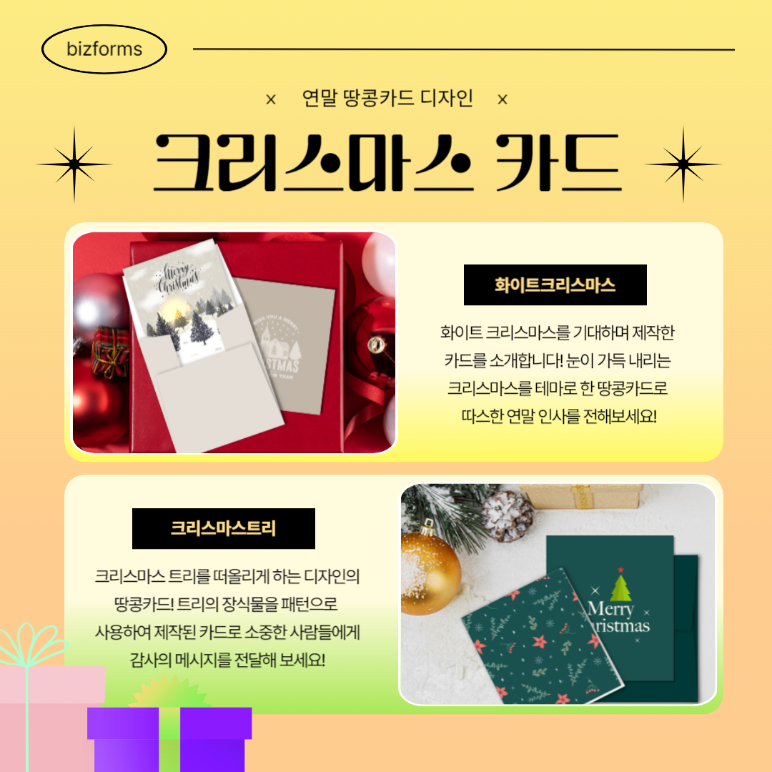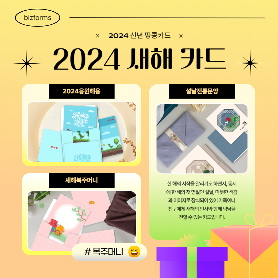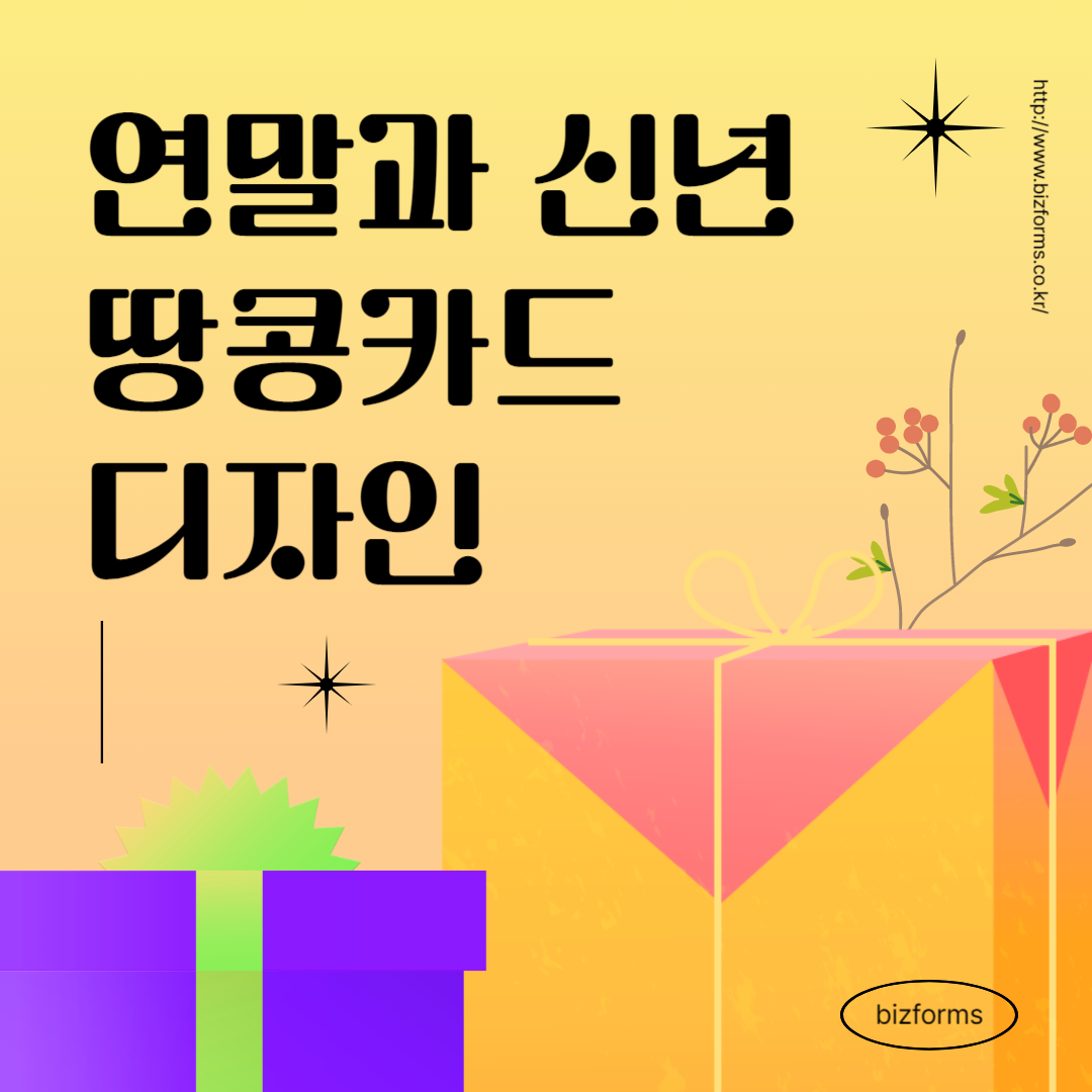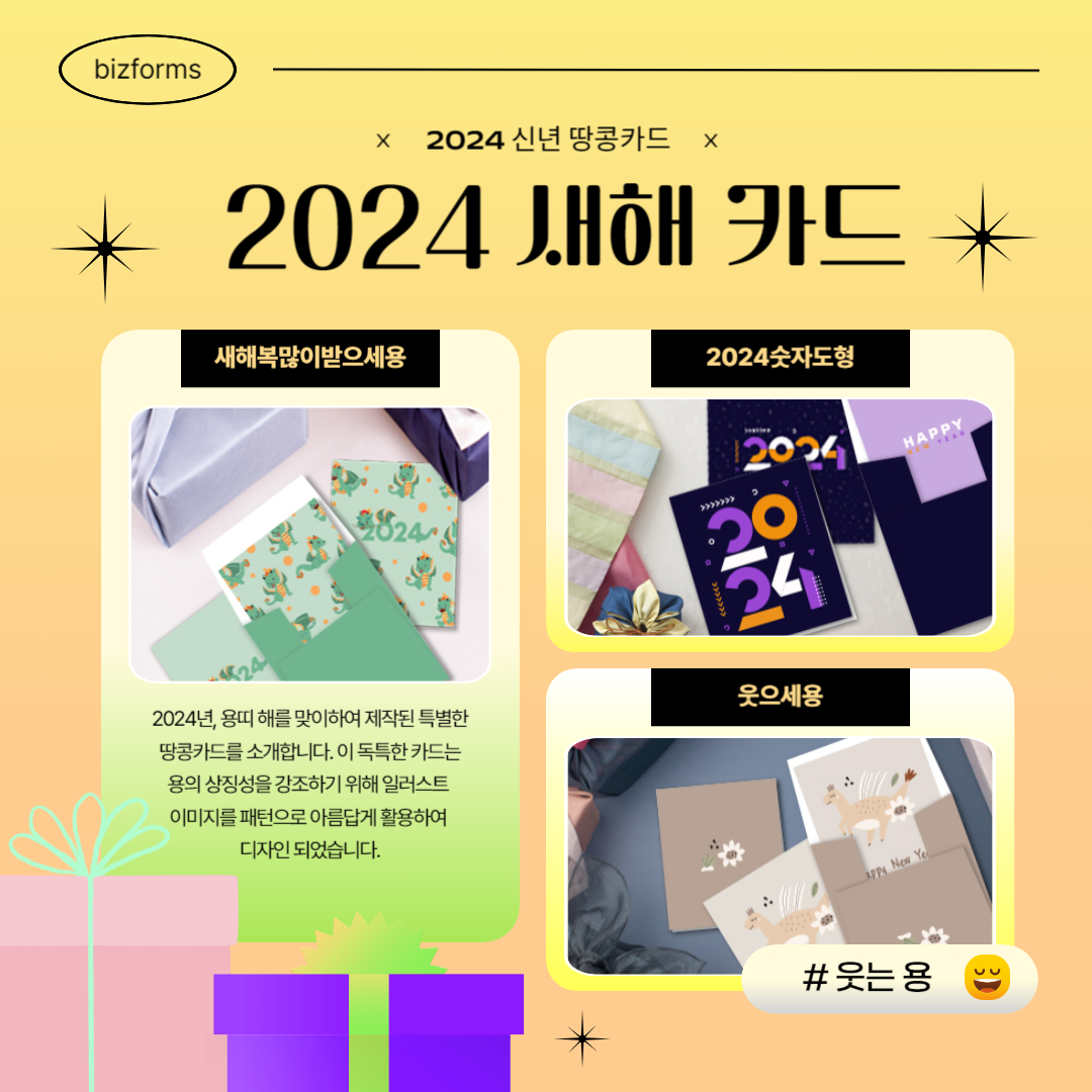 총 2종의 크리스마스 카드와 2024를 맞이하여 제작된 6종의 신년카드, 총 8종의 땅콩카드를 소개드렸습니다. 비즈폼에서 제공하는 땅콩카드는 각각의 독특한 디자인과 메시지를 담고 있어, 다양한 분들에게 전하실 수 있는 선택지를 제공합니다.